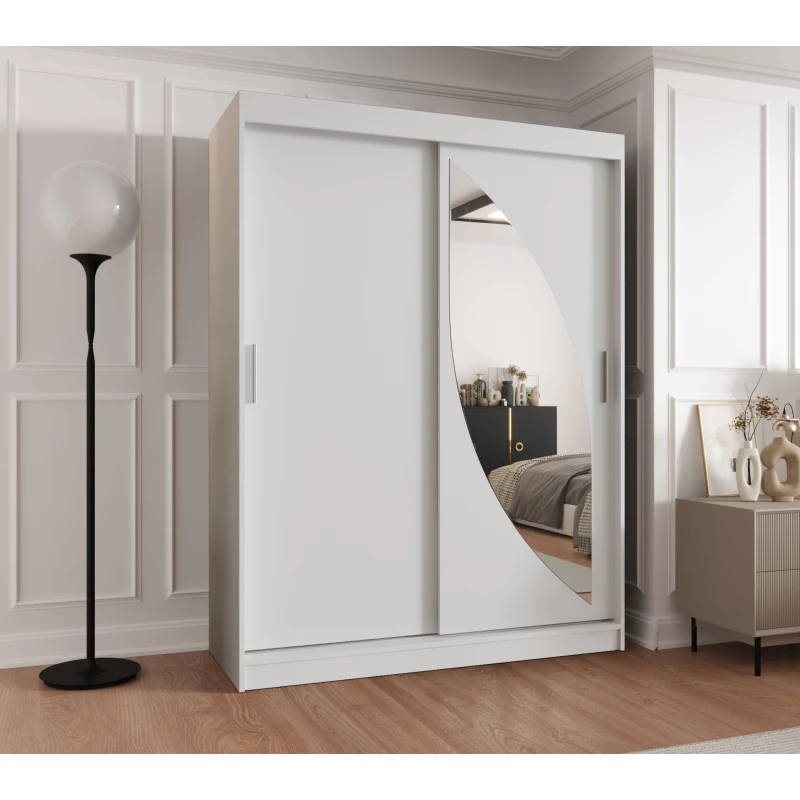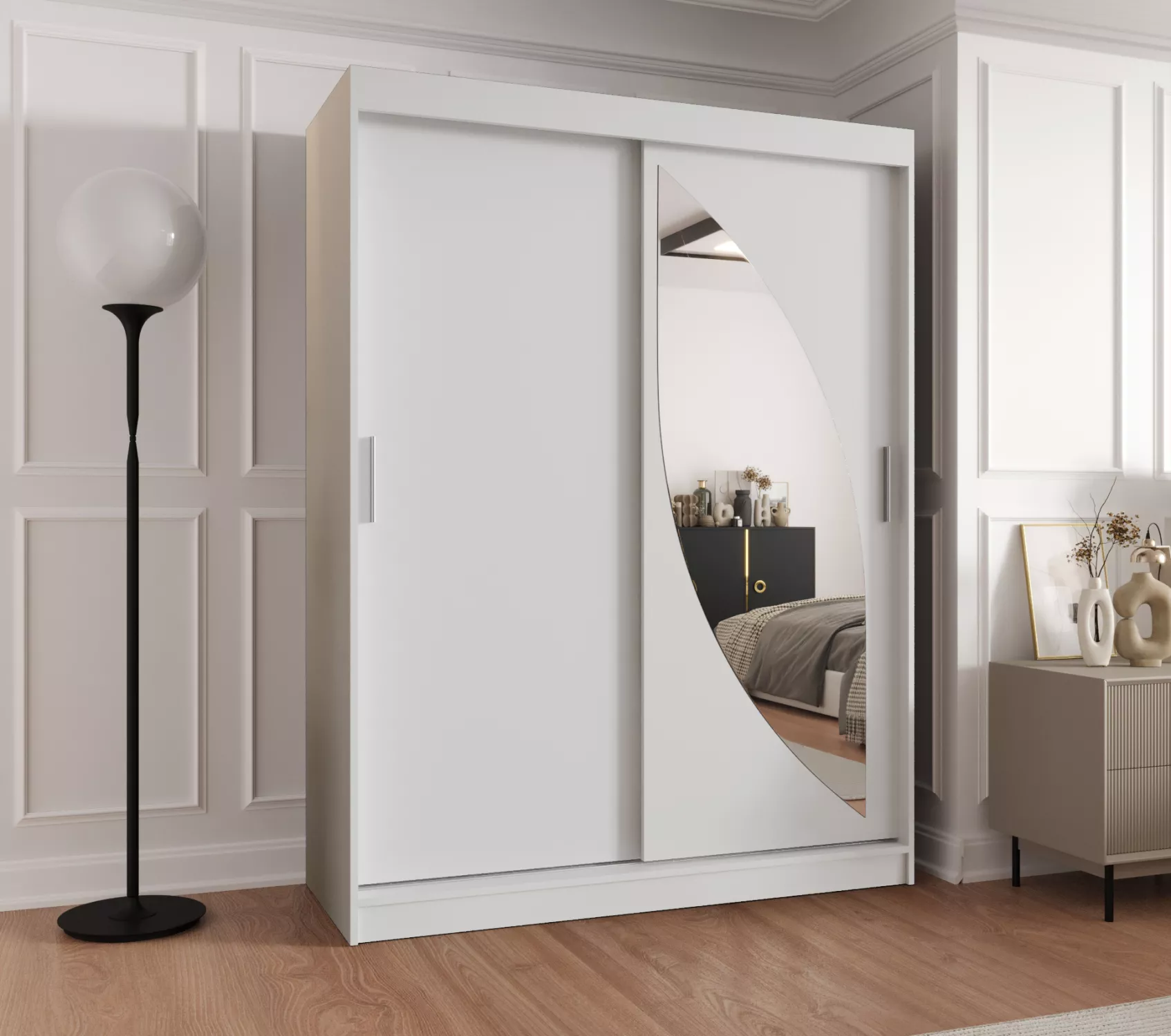 Šatní skříň 150 cm SUDENA s posuvnými dveřmi díky svému vnitřnímu uspořádání nabízí dostatek úložného prostoru. Zrcadlo opticky zvětší prostor.