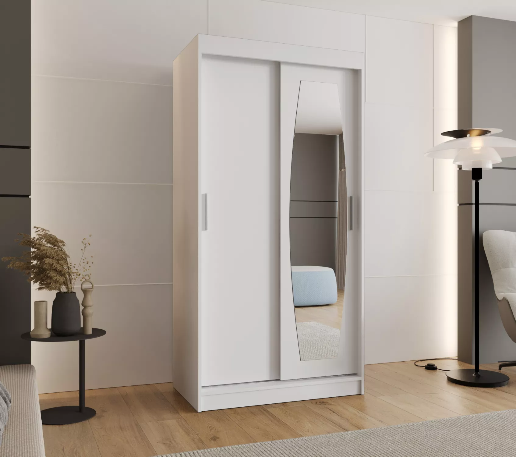 Šatní skříň 100 cm SEYMA s praktickým vnitřním prostorem představuje ideální řešení pro moderní ložnice. Zrcadlo opticky zvětší a prosvětlí místnost.