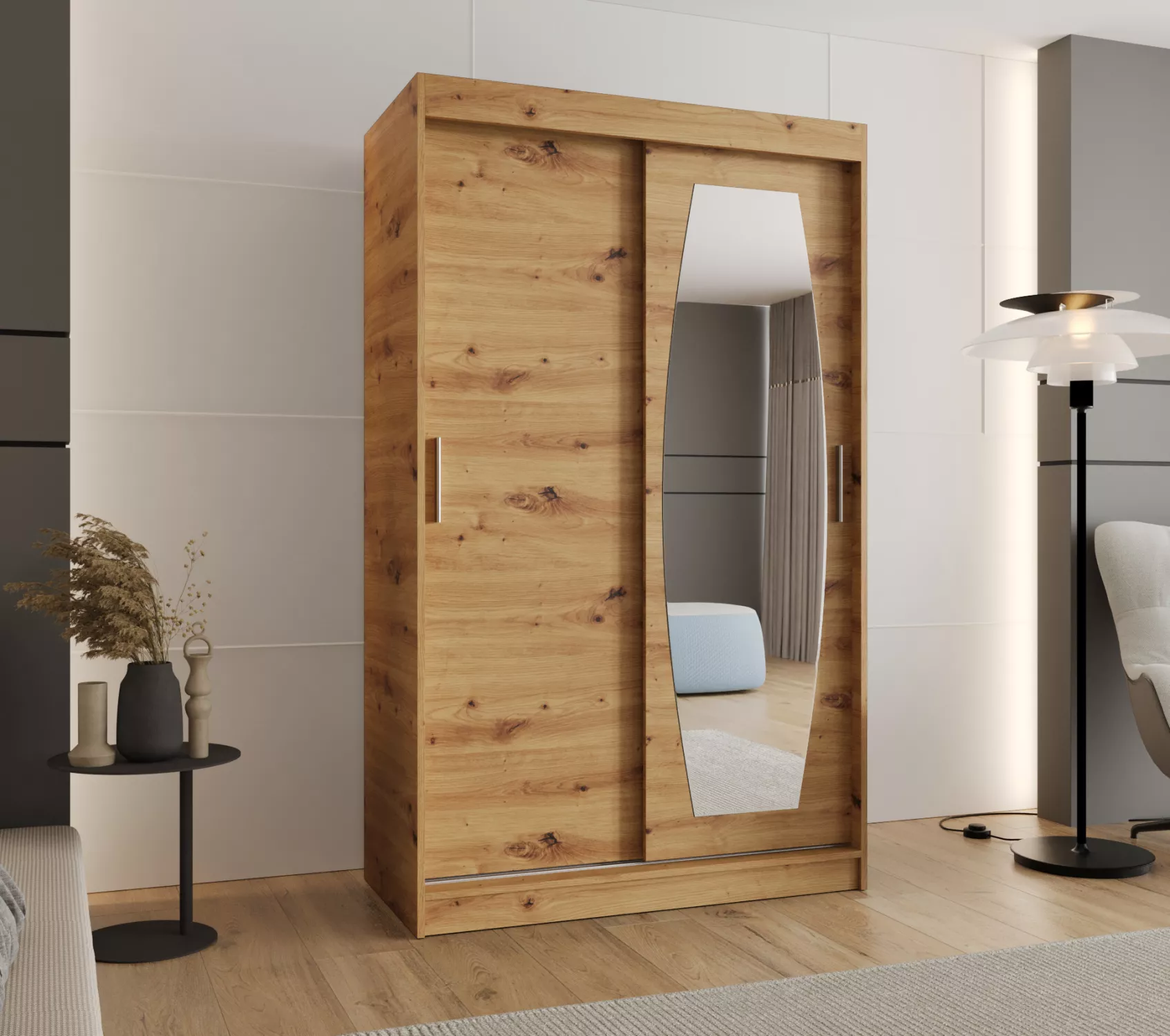 Šatní skříň 120 cm SEYMA s praktickým vnitřním prostorem představuje ideální řešení pro moderní ložnice. Zrcadlo opticky zvětší a prosvětlí místnost.