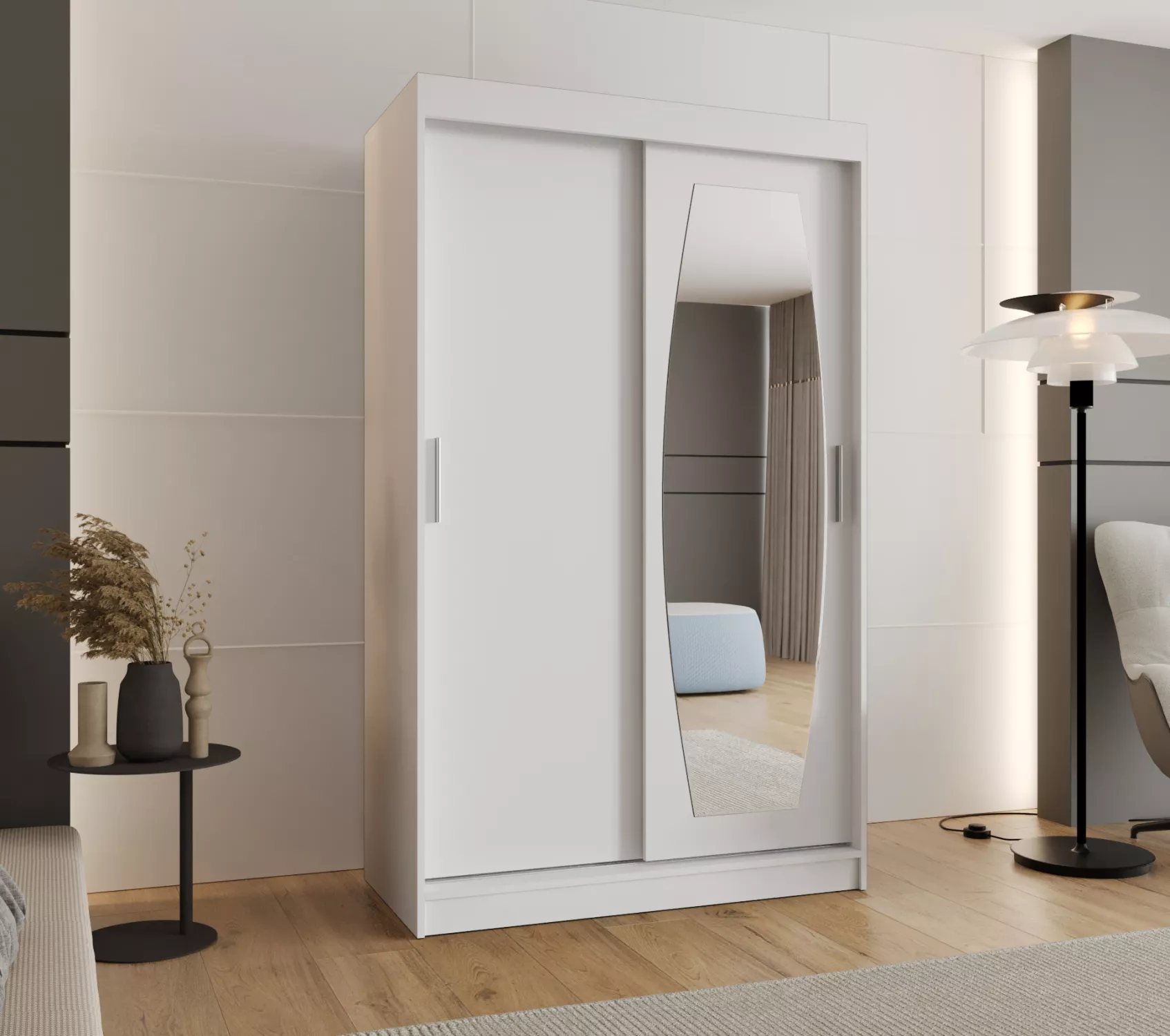 Šatní skříň 120 cm SEYMA s praktickým vnitřním prostorem představuje ideální řešení pro moderní ložnice. Zrcadlo opticky zvětší a prosvětlí místnost.