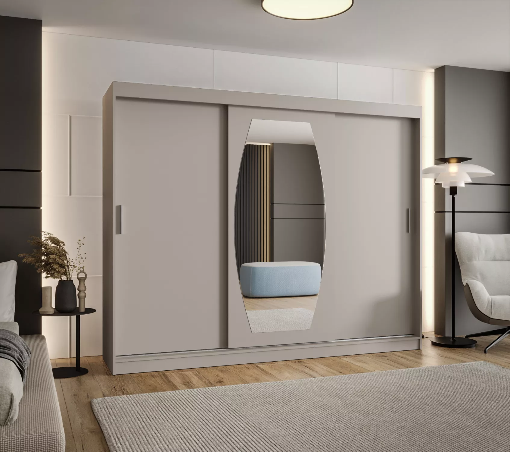Šatní skříň 250 cm SEYMA s praktickým vnitřním prostorem představuje ideální řešení pro moderní ložnice. Zrcadlo opticky zvětší a prosvětlí místnost.