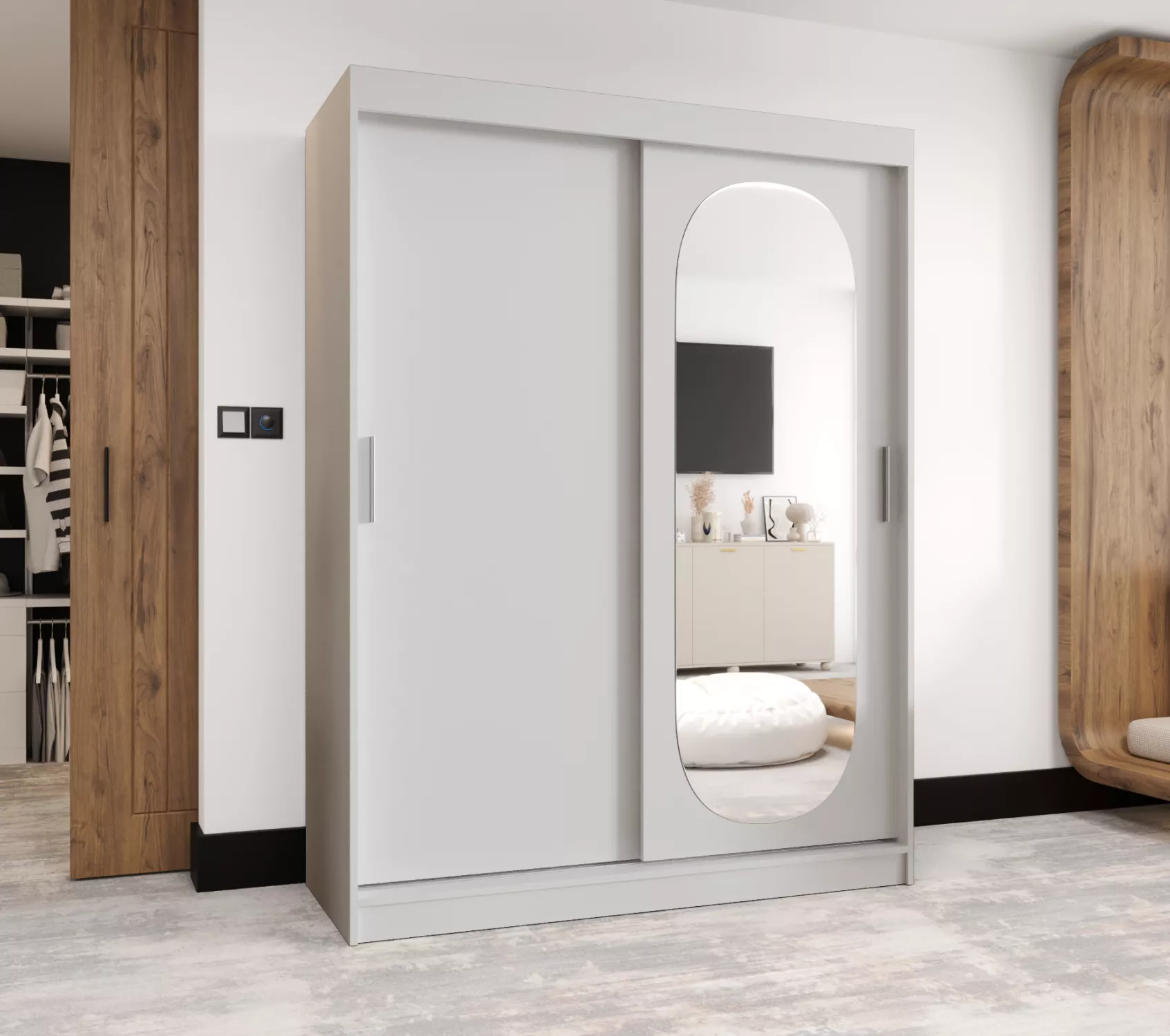 Šatní skříň 150 cm BEREN se zrcadlem kombinuje moderní vzhled s prakticky řešeným vnitřním vybavením, které usnadní organizaci a každodenní užívání.