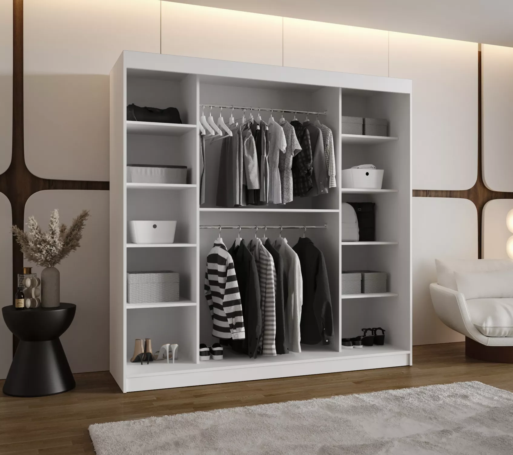Šatní skříň 200 cm BEREN se zrcadlem kombinuje moderní vzhled s prakticky řešeným vnitřním vybavením, které usnadní organizaci a každodenní užívání.