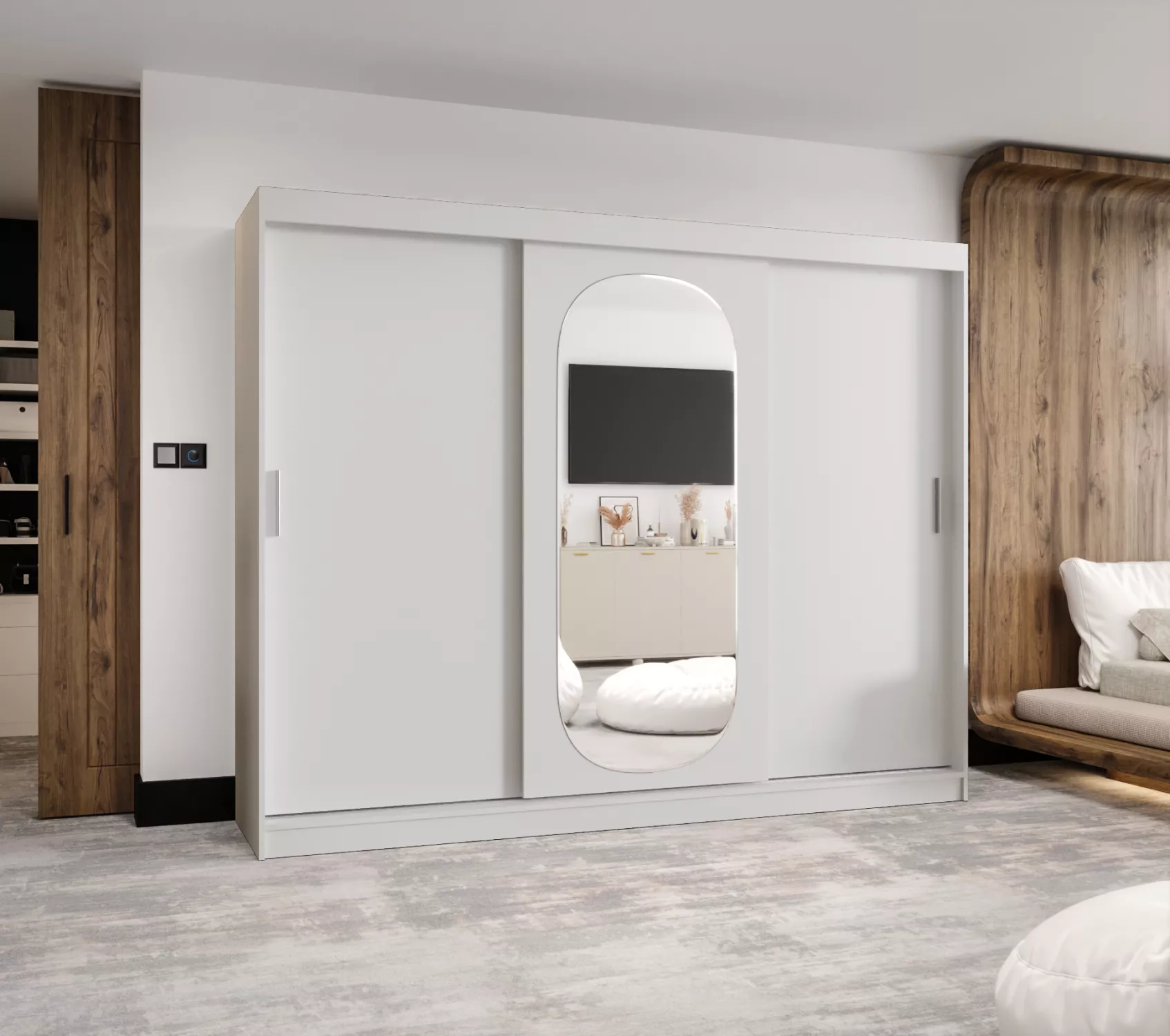 Šatní skříň 250 cm BEREN se zrcadlem kombinuje moderní vzhled s prakticky řešeným vnitřním vybavením, které usnadní organizaci a každodenní užívání.