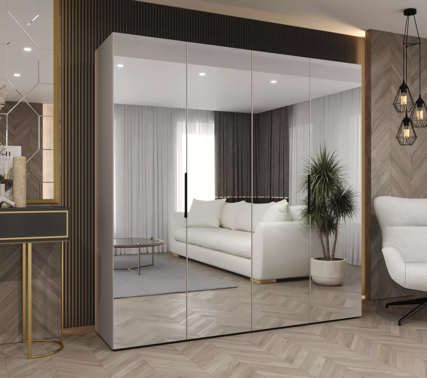 Zrcadlová šatní skříň 200 cm RABIA opticky zvětší a projasní interiér. Vnitřní prostor tvoří 2 police a šatní tyče.