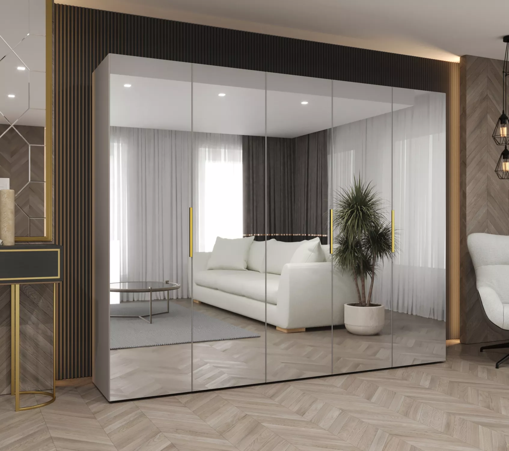 Zrcadlová šatní skříň 250 cm RABIA - kašmírová / zlatá
