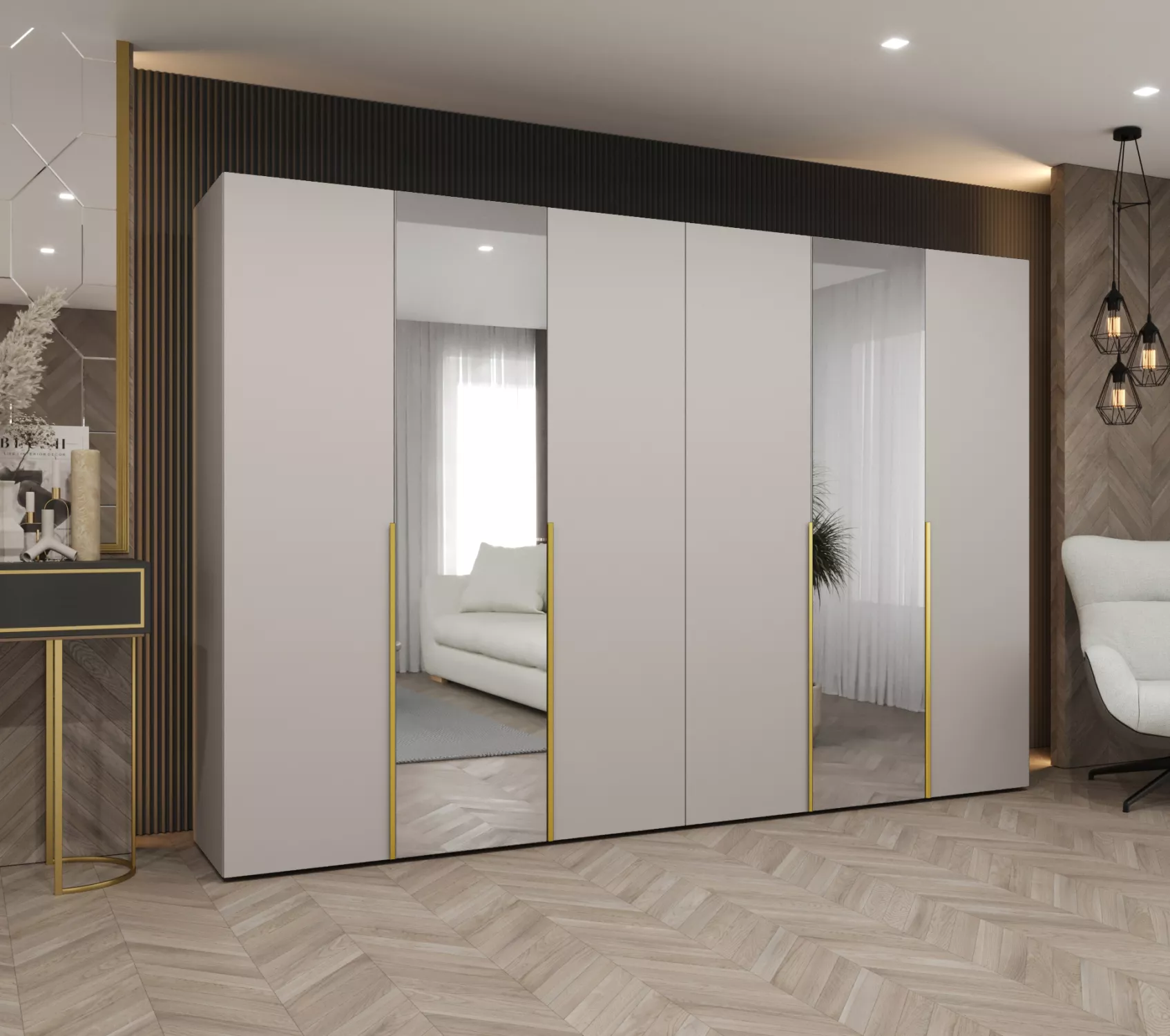 Šatní skříň 300 cm ASUDA se zrcadly - kašmír / zlatá