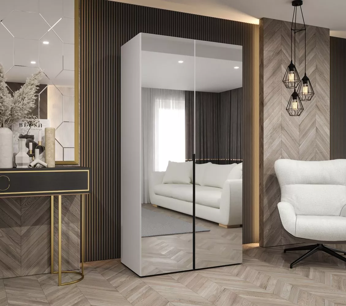 Zrcadlová šatní skříň 100 cm BUGRA opticky zvětší a projasní interiér. Vnitřní prostor tvoří 1 police a šatní tyč.