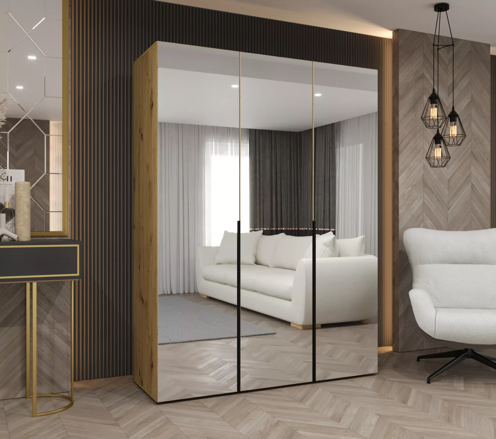 Zrcadlová šatní skříň 150 cm BUGRA - dub artisan / černá