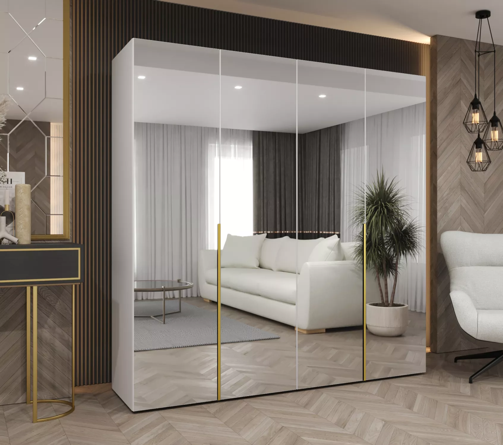 Zrcadlová šatní skříň 200 cm BUGRA - bílá / zlatá