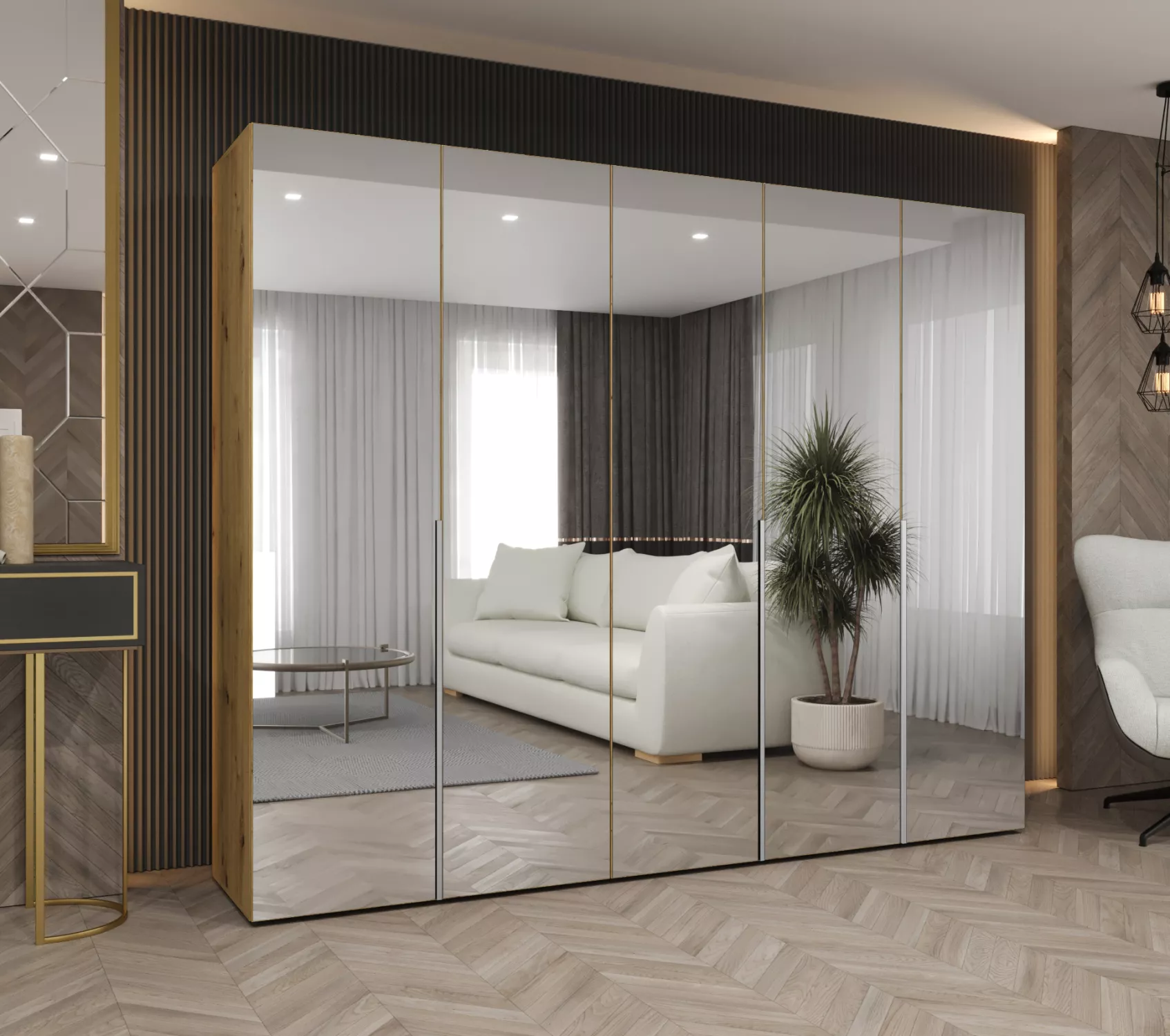 Zrcadlová šatní skříň 250 cm BUGRA - dub artisan / stříbrná