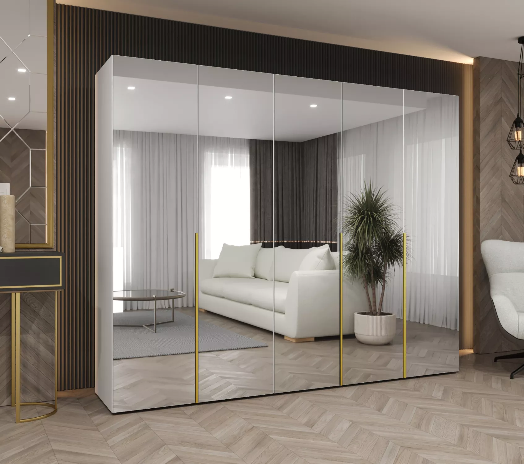 Zrcadlová šatní skříň 250 cm BUGRA - bílá / zlatá