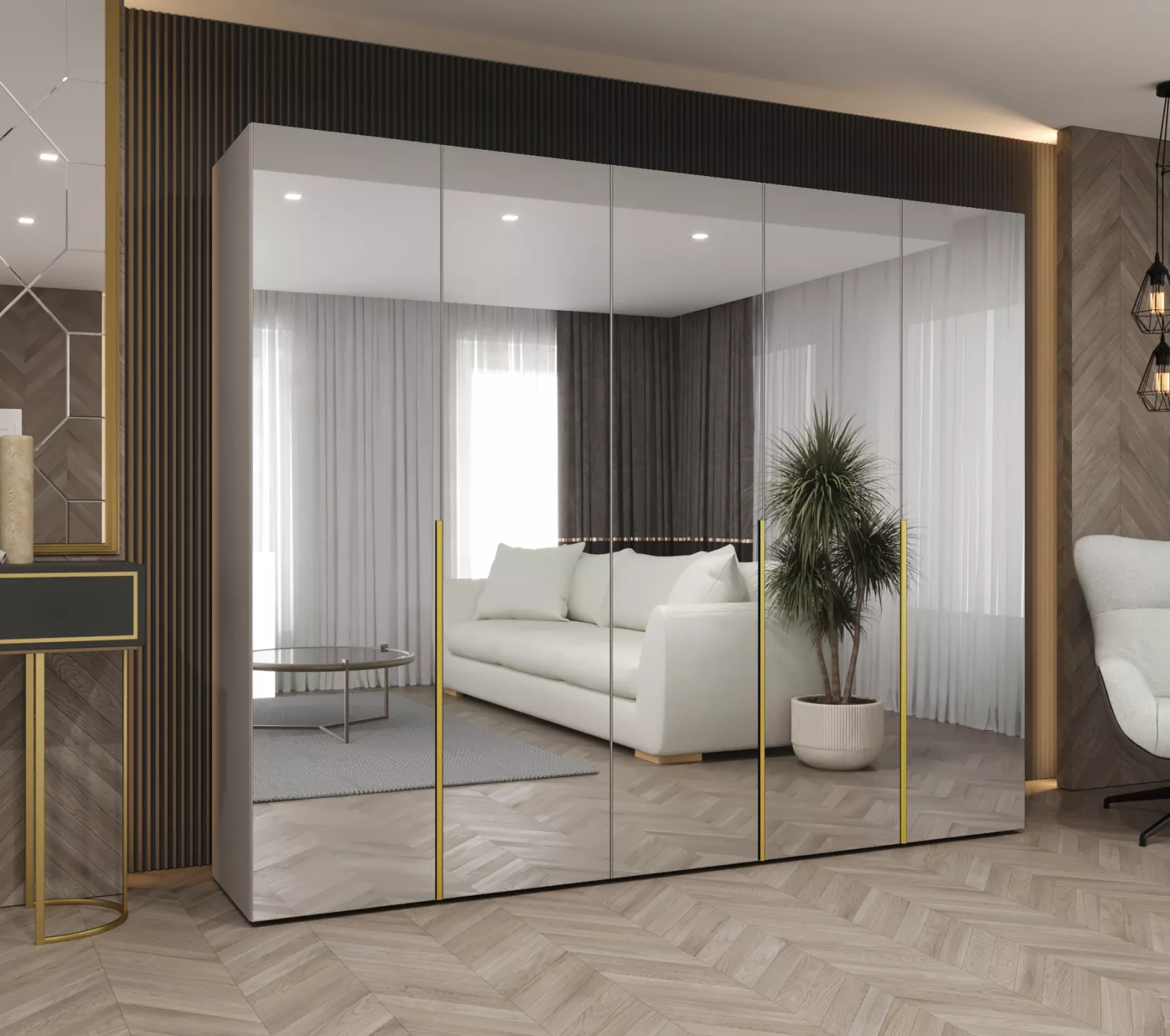 Zrcadlová šatní skříň 250 cm BUGRA - kašmírová / zlatá