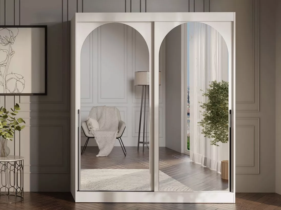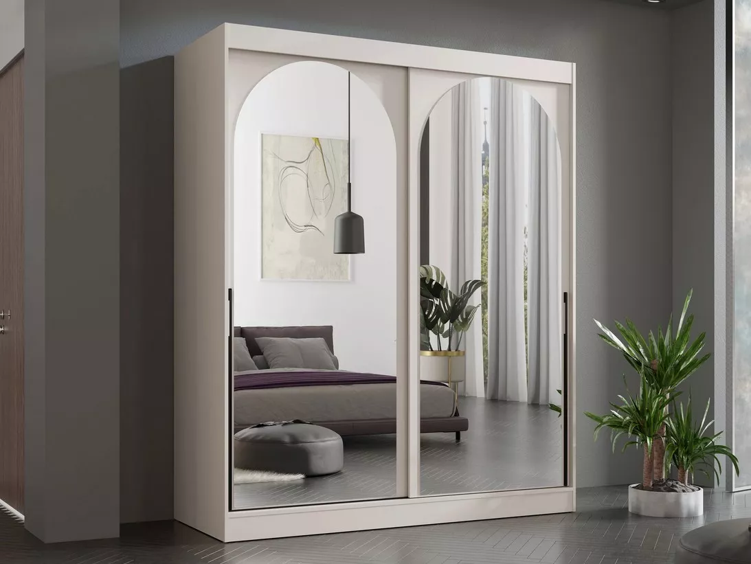 Objevte šatní skříň IVAFE a vdechněte svému interiéru moderní eleganci. Posuvné dveře zdobí praktické zrcadlo, které opticky zvětšuje prostor a zvyšuje funkčnost. Interiér skříně poskytuje dostatek úložného prostoru.