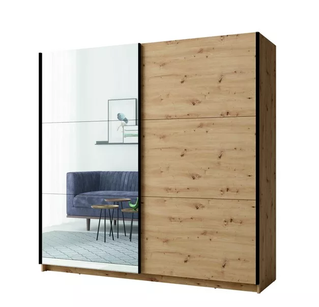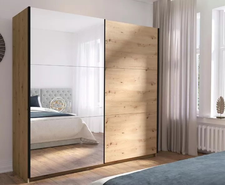 Objevte šatní skříň APASTO a vnesete do svého domova pořádek i styl. Vnitřní prostor s šatní tyčí na ramínka a prostornými policemi nabízí dostatek místa pro kabáty, oblečení i doplňky, zatímco výška přes 200 cm zajišťuje maximální využití úložného prostoru. Zrcadlo na dvířkách opticky projasní interiér.
