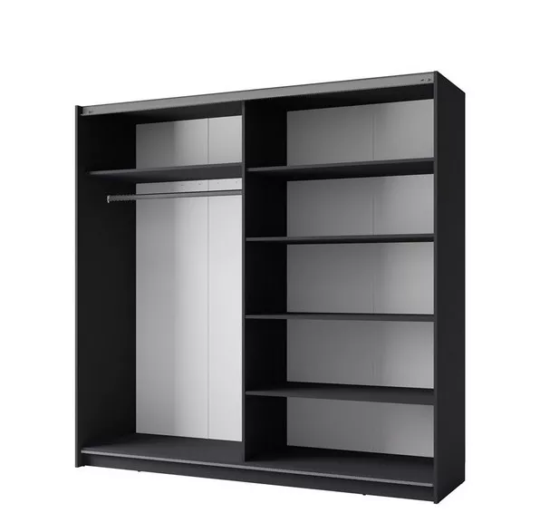 Objevte šatní skříň APASTO a vnesete do svého domova pořádek i styl. Vnitřní prostor s šatní tyčí na ramínka a prostornými policemi nabízí dostatek místa pro kabáty, oblečení i doplňky, zatímco výška přes 200 cm zajišťuje maximální využití úložného prostoru. Zrcadlo na dvířkách opticky projasní interiér.