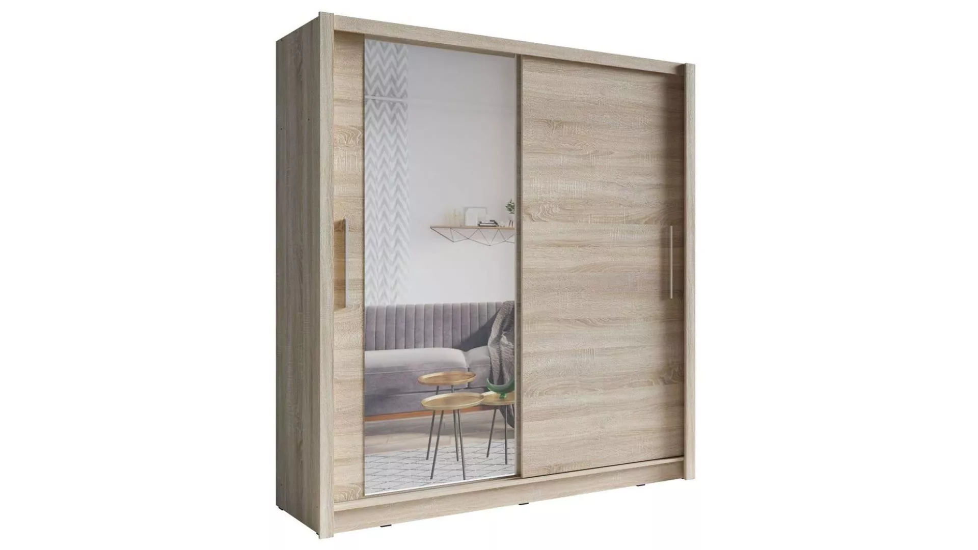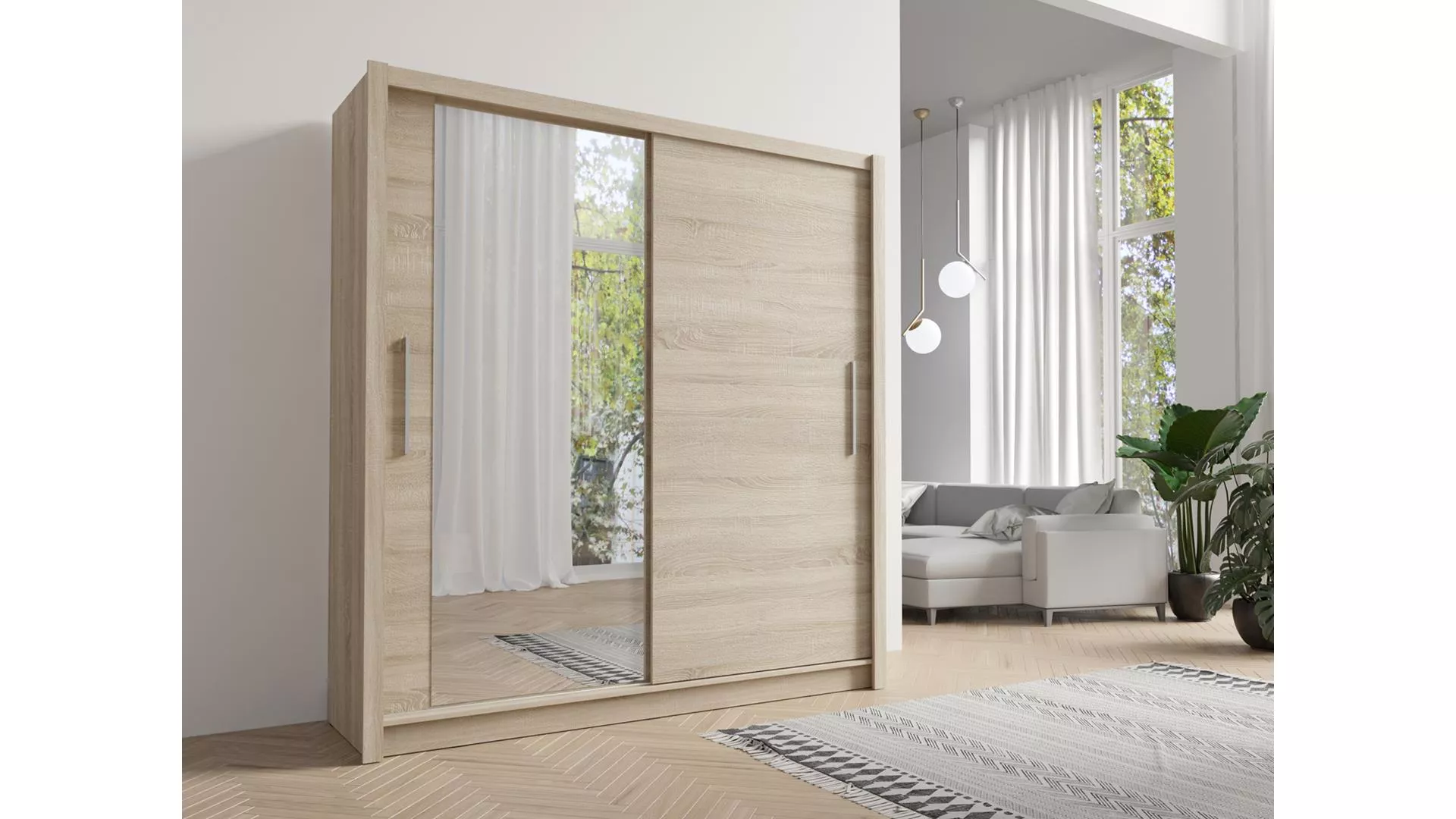Pořiďte si šatní skříň ARMENIA a spojte praktičnost s moderní elegancí. Vysoká konstrukce s posuvnými dveřmi šetří místo, zrcadlo na dvířkách opticky zvětší prostor a dlouhá matná hliníková rukojeť dodává nábytku styl. Vnitřní uspořádání s šatní tyčí a úzkými policemi zajistí přehledné uložení oblečení i doplňků.