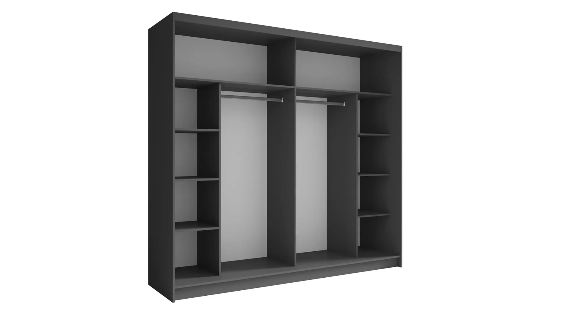 Objevte šatní skříň DUITAMA a vneste do ložnice styl i řád. Velké zrcadlo opticky zvětší prostor, posuvné dveře šetří místo a vnitřní členění se 2 šatními tyčemi a policemi poskytne dostatek úložného prostoru. Matné provedení v moderním designu dodává interiéru elegantní a nadčasový vzhled.