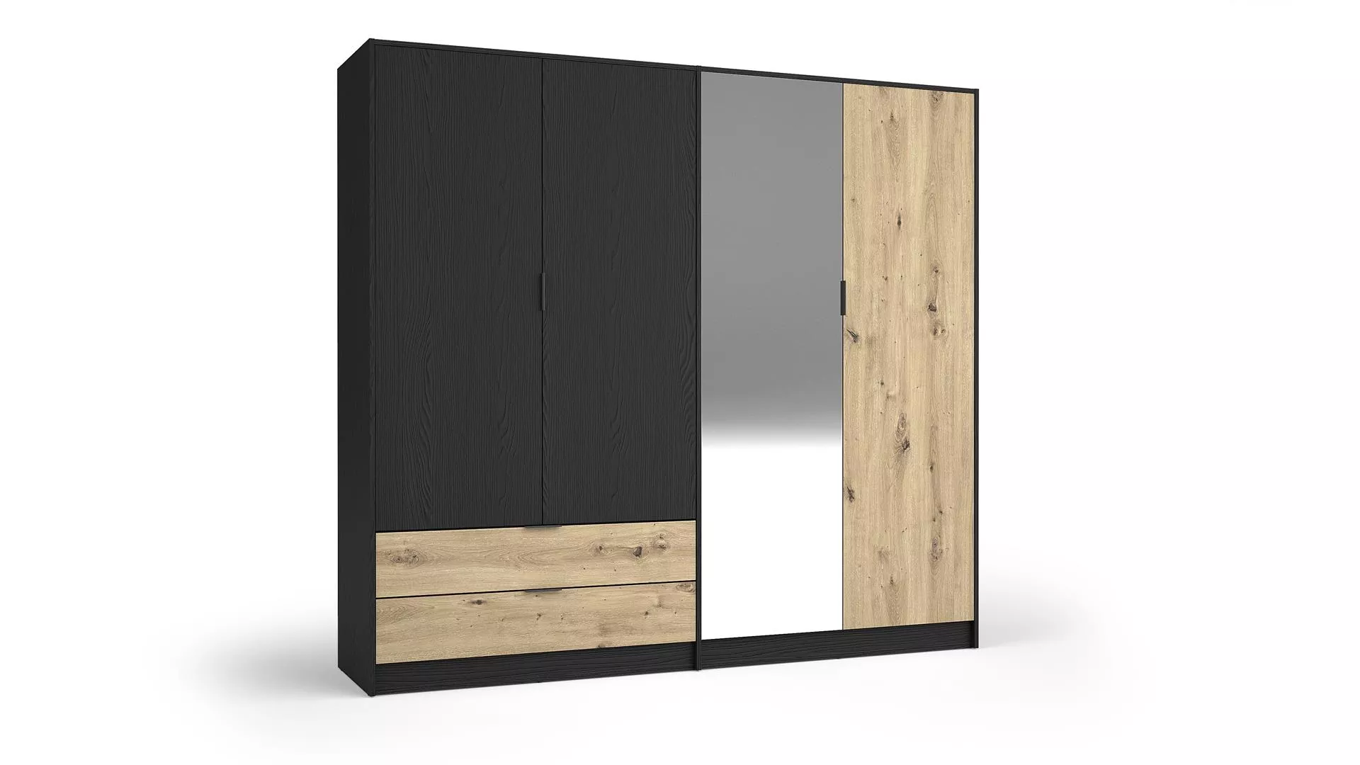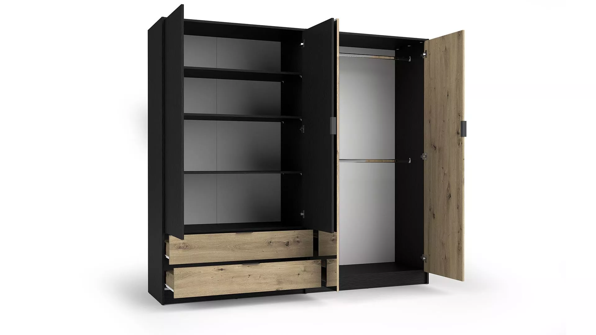 Dopřejte si šatní skříň SALAMINA a spojte výrazný styl s praktickým řešením. Čtyřdveřová konstrukce s velkým zrcadlem a zásuvkami nabízí dostatek místa na oblečení i doplňky. Černá grafitová barva spolu s teplým dekorem dubu artisan dodává interiéru moderní, a přitom útulnou atmosféru.