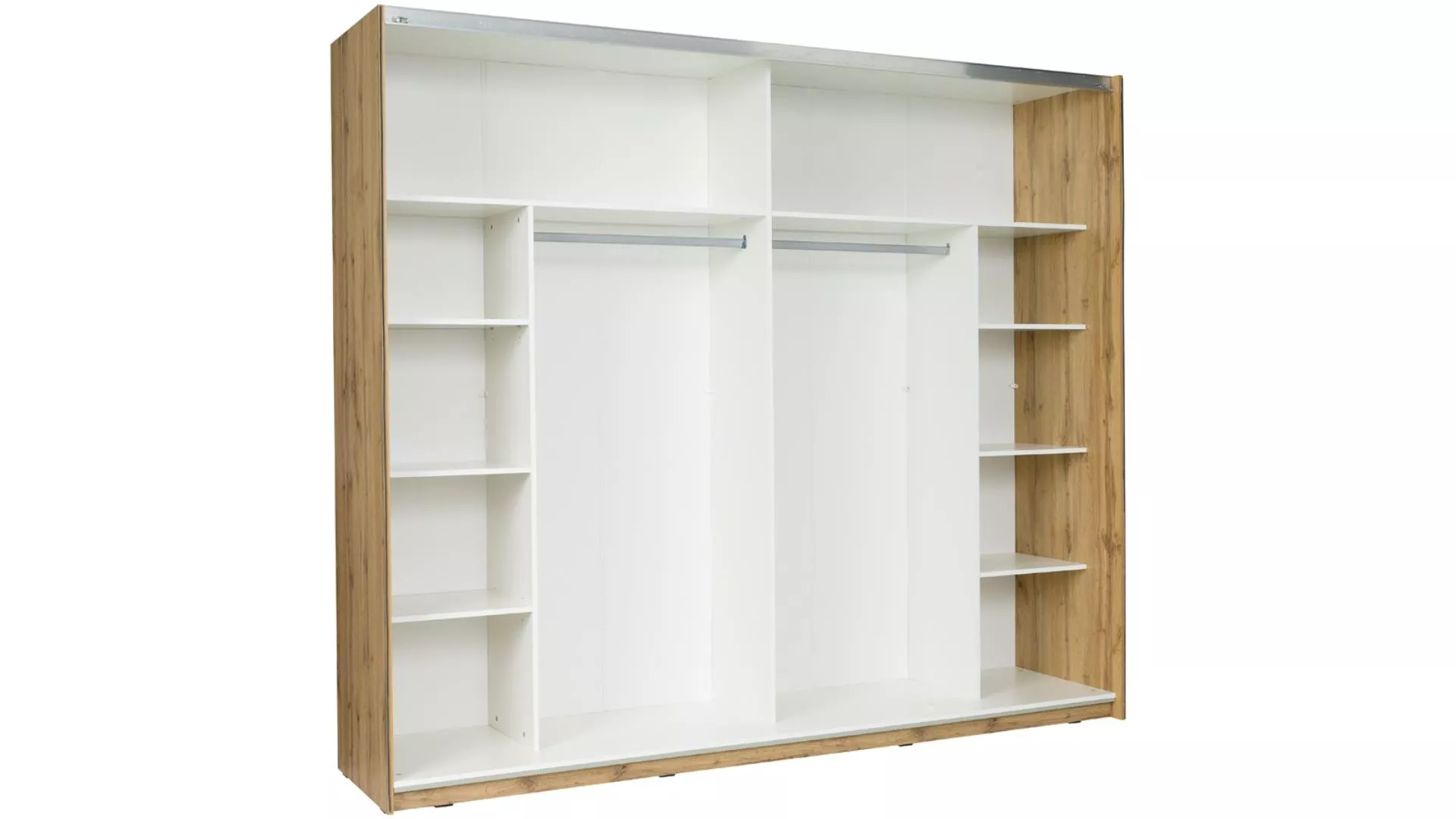 Pořiďte si šatní skříň GARZON a propojte praktičnost s přírodním šarmem. Zrcadlové posuvné dveře šetří místo, opticky zvětšují místnost a doplňují úložný prostor o stylový prvek. Kombinace bílého lesku a dekoru dubu wotan dodává interiéru teplý nádech i moderní eleganci.