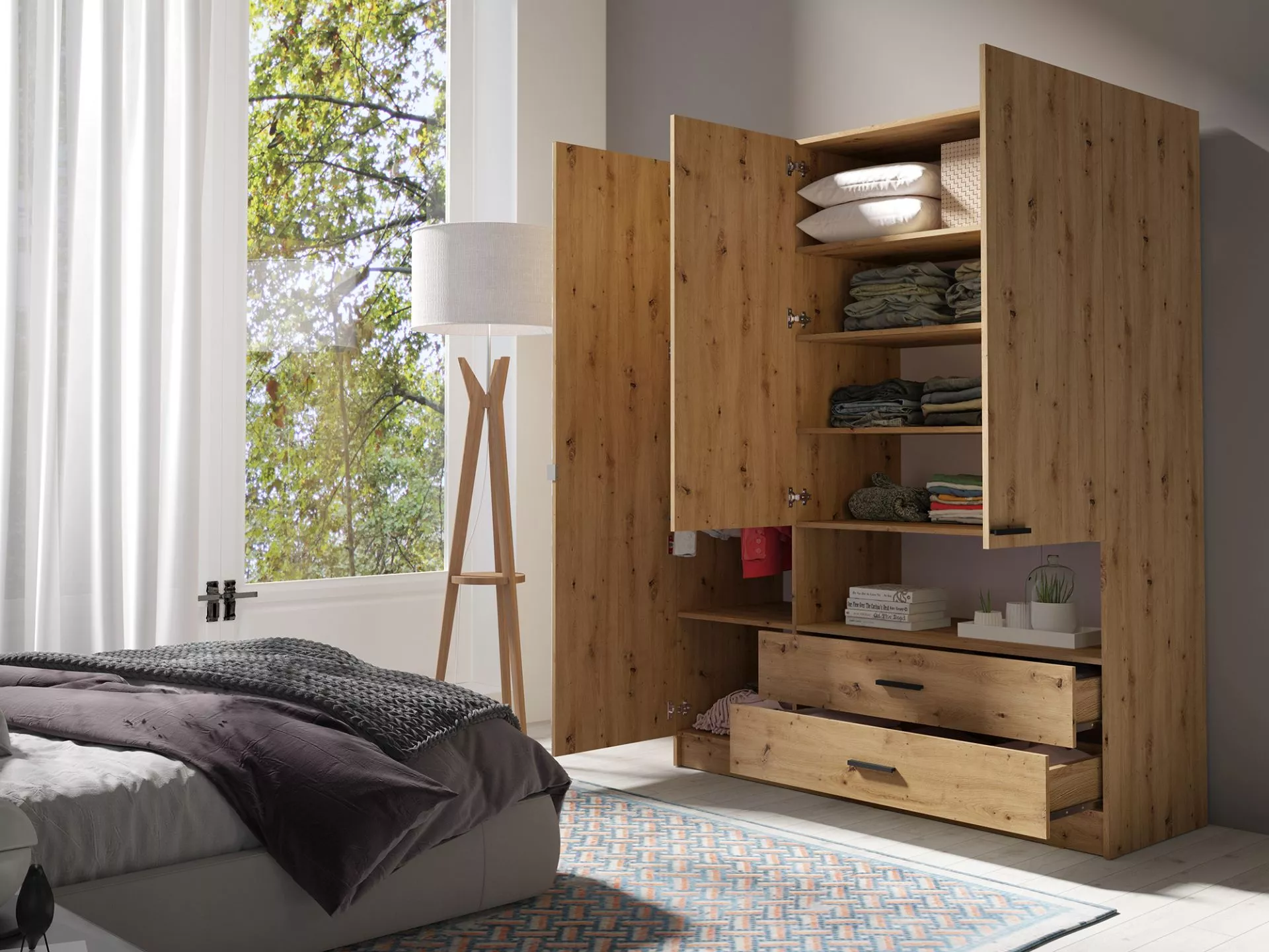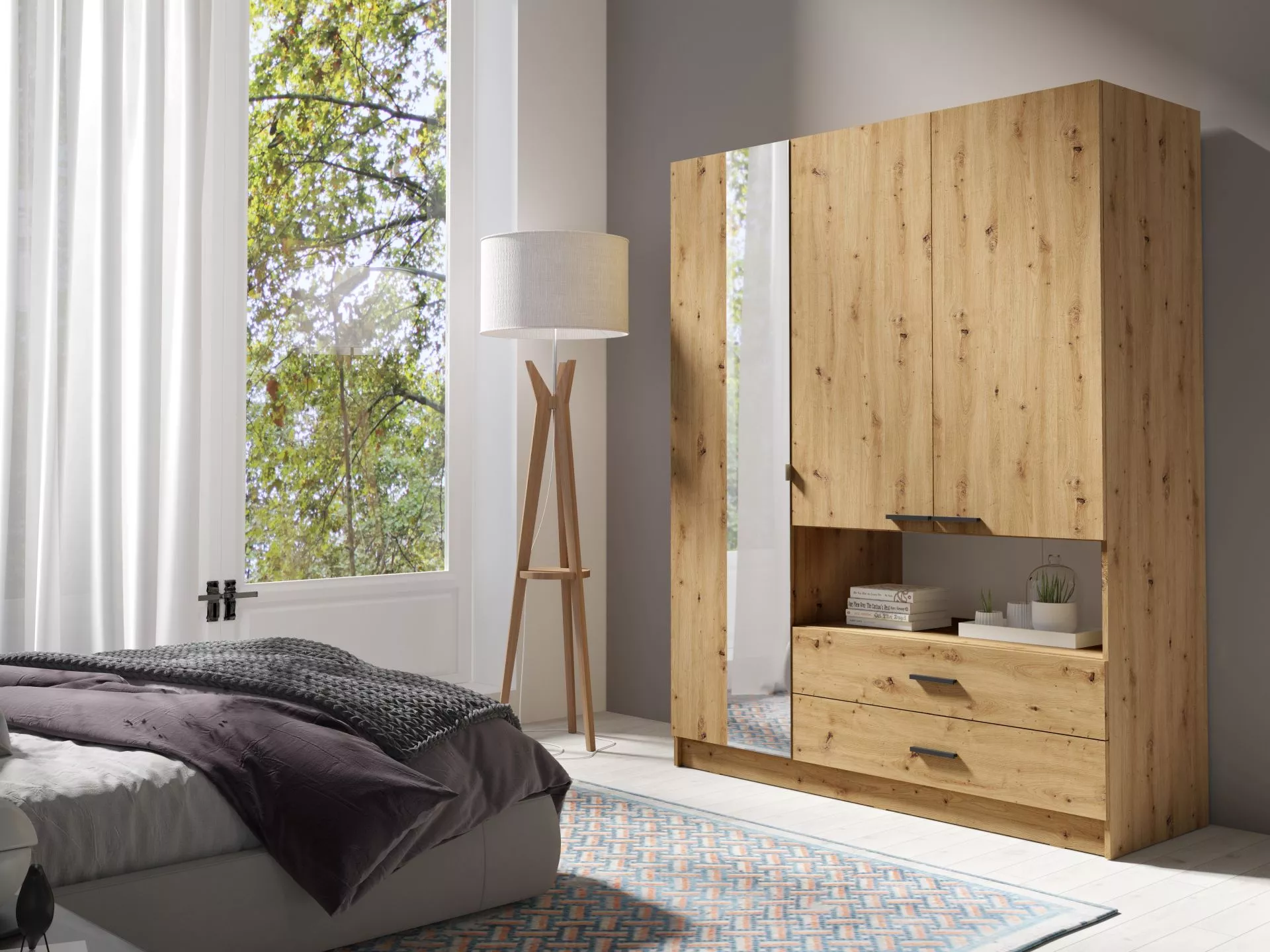 Objevte šatní skříň CALARCA a vdechněte své ložnici moderní eleganci i chytré úložné řešení. Praktické zrcadlo opticky zvětšuje prostor, zatímco zásuvky, police a šatní tyč zajistí dokonalý přehled o všem oblečení. Decentní otevřená polička a černé úchytky dodávají nábytku osobitý styl.