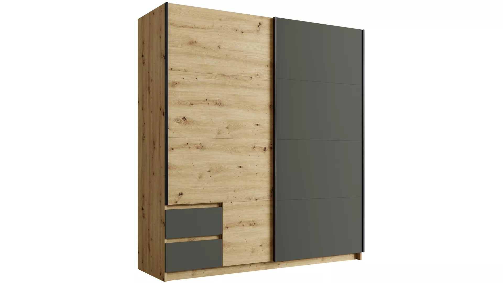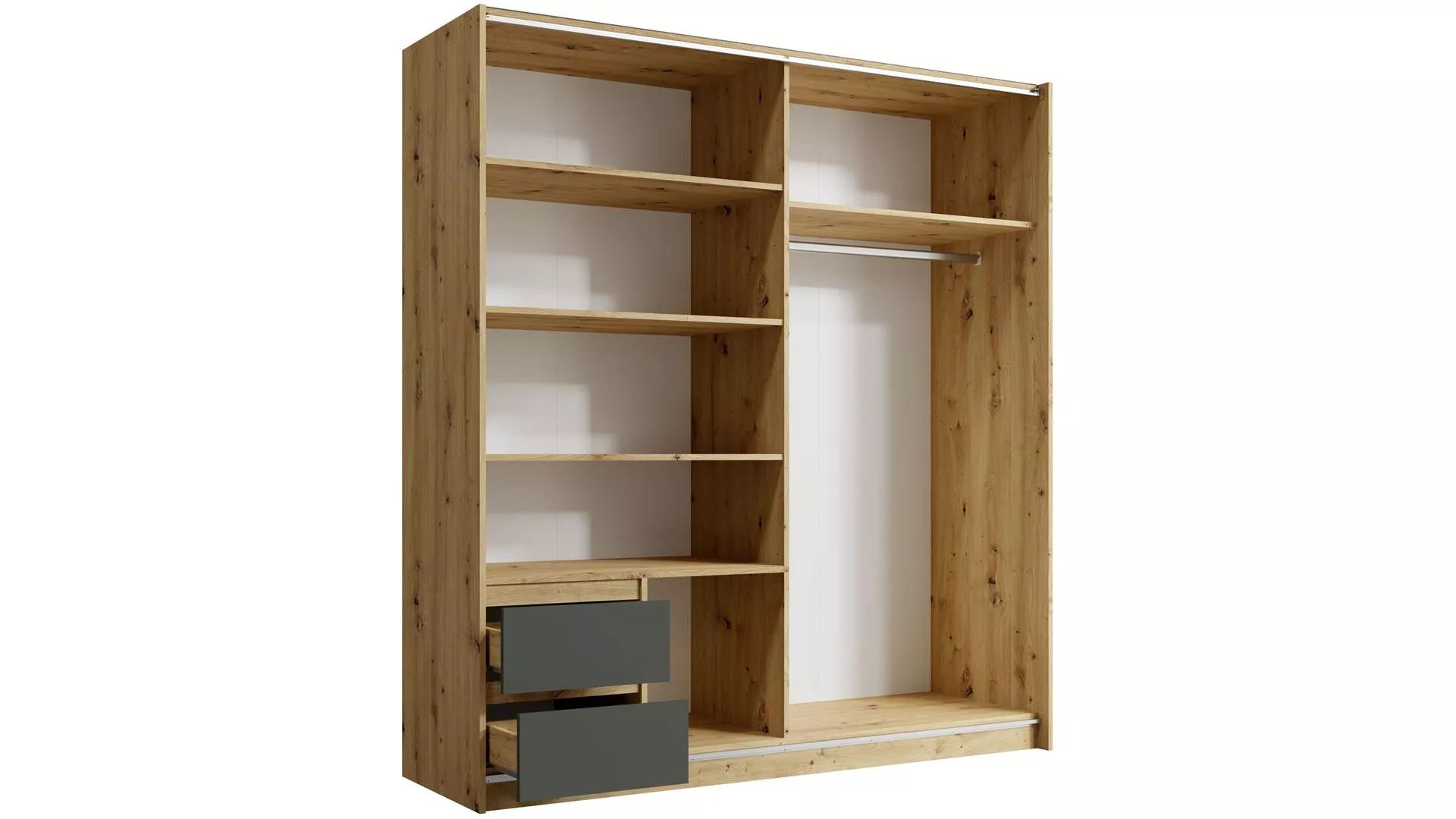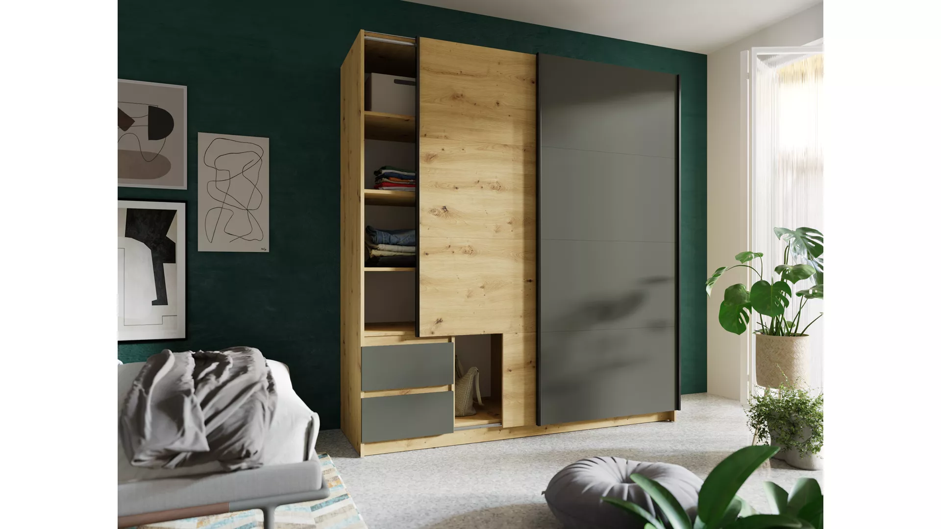 Objevte vysokou šatní skříň ANSERMA a vneste do ložnice styl i praktičnost. Moderní kombinace šedého grafitu a dubu artisan dodává interiéru elegantní, hřejivý nádech. Díky 2 posuvným dveřím, 2 zásuvkám, 4 policím a šatní tyči získáte promyšlený prostor pro přehledné uložení všeho důležitého.