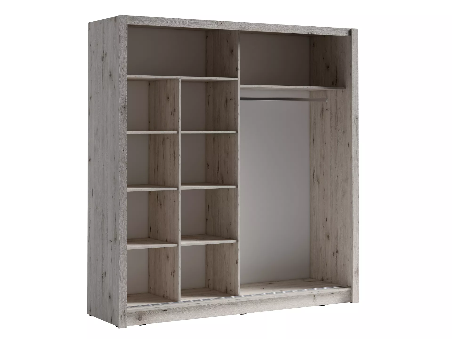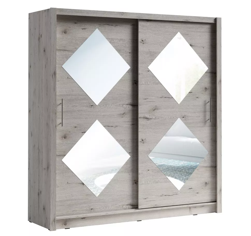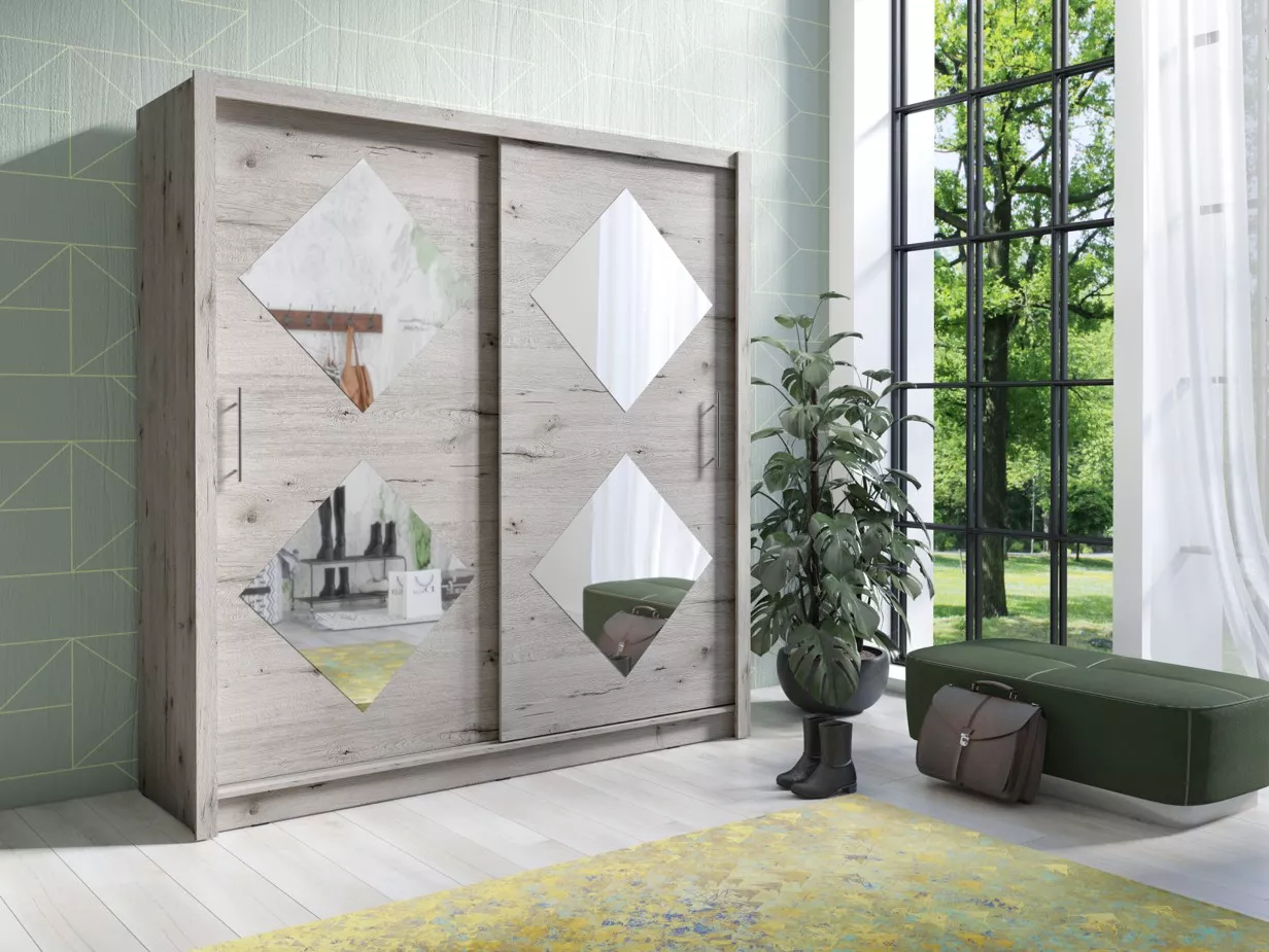Pořiďte si zrcadlovou šatní skříň SOATA a proměňte ložnici v moderní a funkční prostor. Neobvyklé uspořádání zrcadel dodává skříni jedinečný a stylový vzhled. Praktický interiér s policemi a šatní tyčí nabízí dostatek místa pro uspořádané uložení oblečení i doplňků.