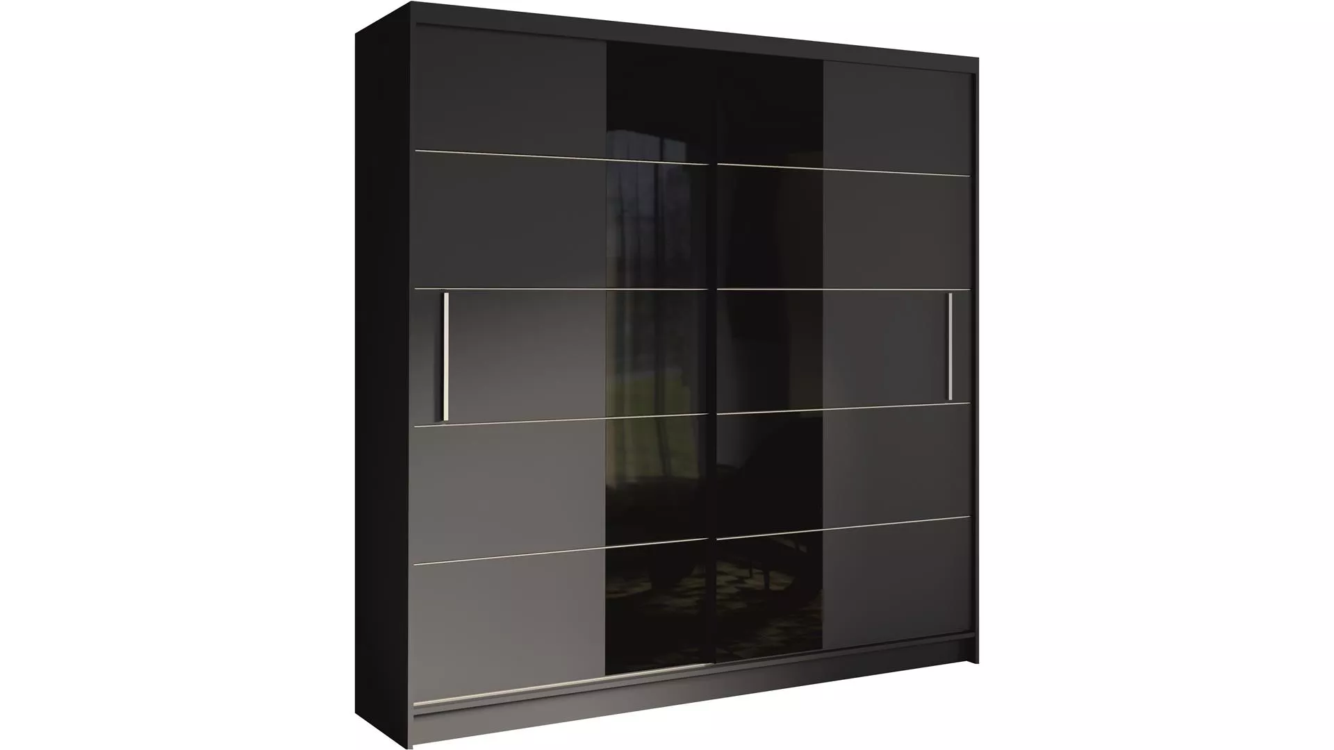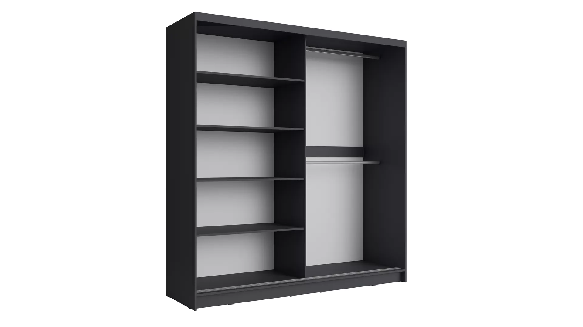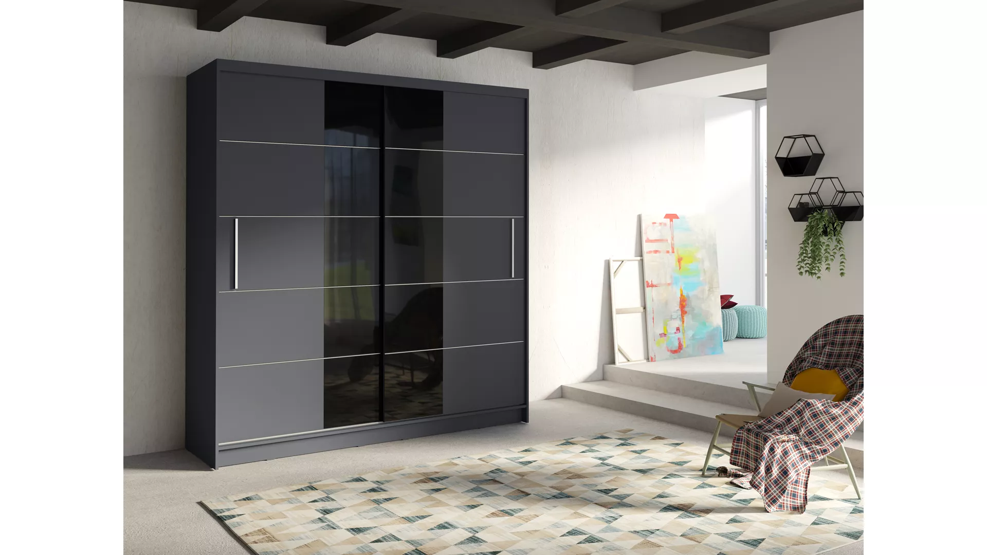 Široká šatní skříň SOGAMO v módní šedo-grafitové barvě s posuvnými dveřmi, které jsou doplněny černým sklem, jež dodává na modernosti. Interiér je vybaven 2 šatními tyčemi a řadou širokých polic, které zajišťují pohodlné uspořádání prostoru.