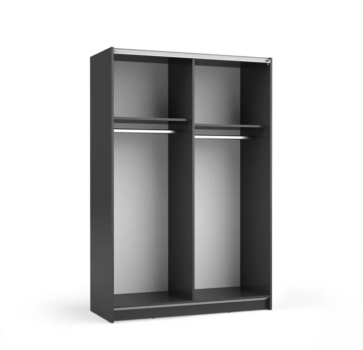 Šatní skříň CARTAGO se zrcadlem a posuvnými dveřmi. Interiér skříně byl navržen s ohledem na maximální funkčnost – je vybaven policemi a šatními tyčemi, které umožňují pohodlné uložení oblečení a dalších předmětů.