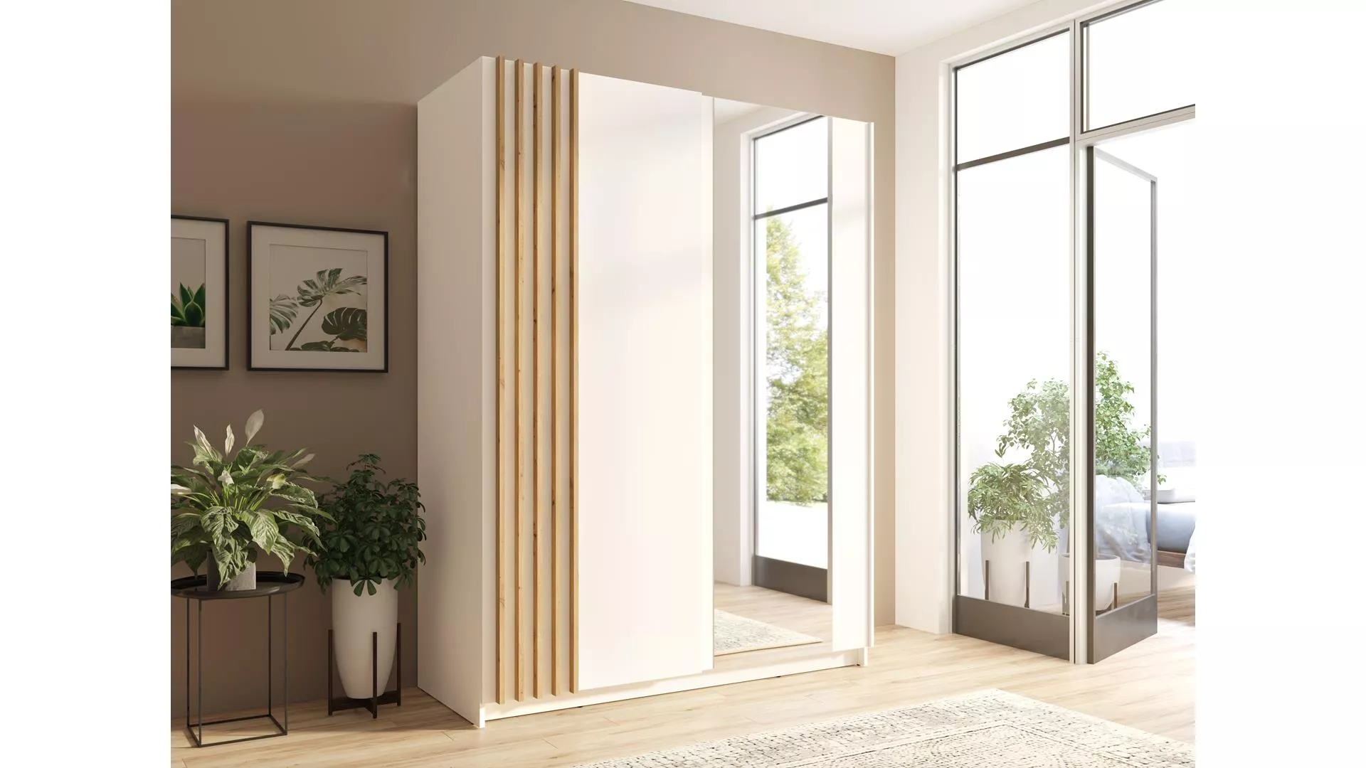 Objevte šatní skříň YUMBO a vdechněte svému interiéru moderní eleganci. Posuvné dveře zdobí lamely v dekoru dubu artisan a praktické zrcadlo, které opticky zvětšuje prostor a zvyšuje funkčnost. Uvnitř najdete šatní tyč a 4 široké police pro přehledné a pohodlné uspořádání.