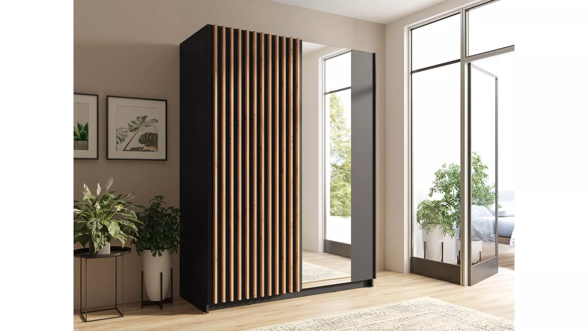 Objevte šatní skříň BUGA a vdechněte svému interiéru moderní eleganci. Posuvné dveře zdobí lamely v dekoru dubu artisan a praktické zrcadlo, které opticky zvětšuje prostor a zvyšuje funkčnost. Uvnitř najdete šatní tyč a 4 široké police pro přehledné a pohodlné uspořádání.