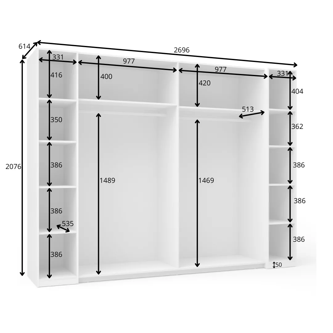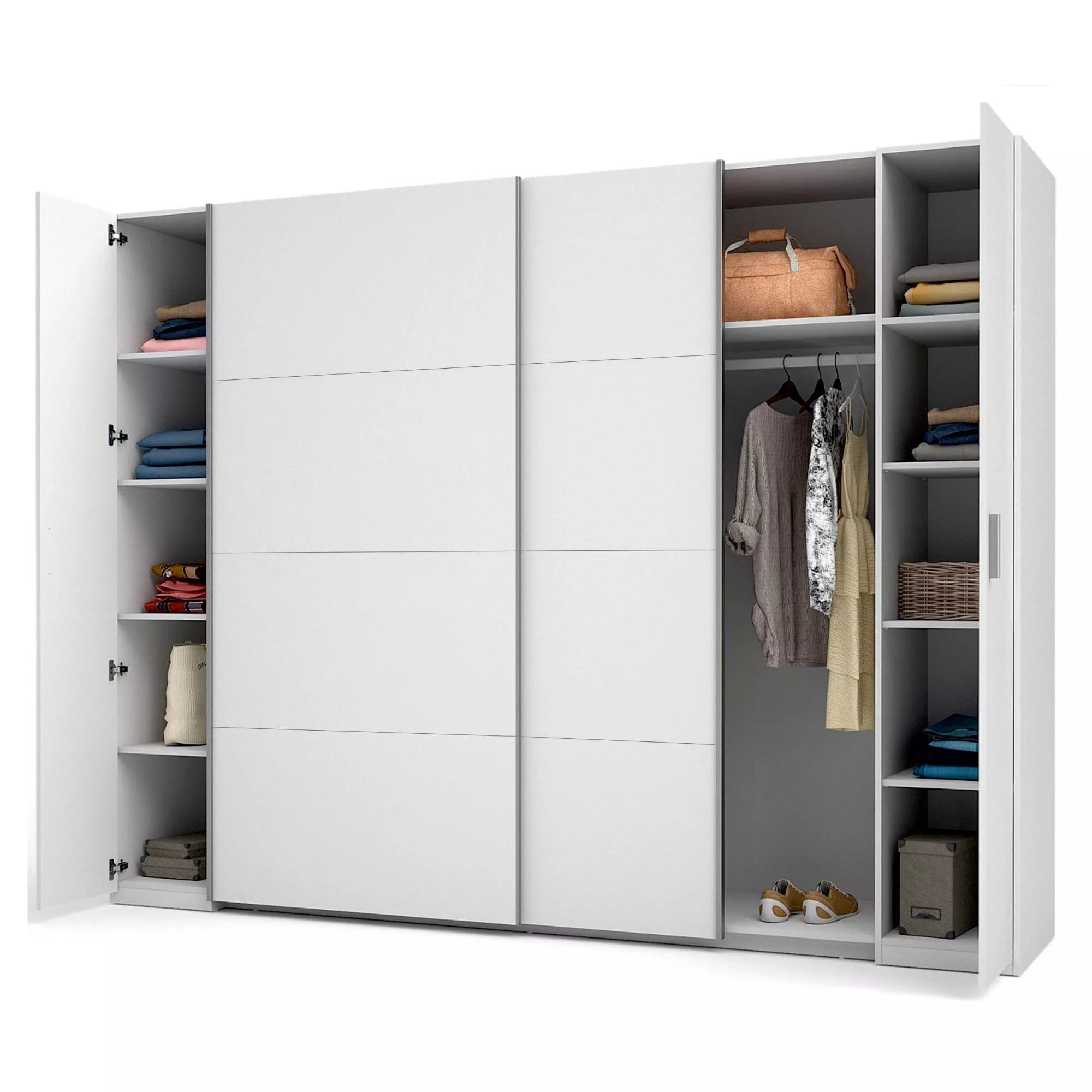 Velká šatní skříň GIRADOT v klasické bílé barvě je vynikající volbou pro ty, kteří hledají funkčnost a elegantní design. Skříň kombinuje klasické otevírací a posuvné dveře, což umožňuje pohodlné přizpůsobení různým prostorům. Interiér skříně byl navržen s ohledem na maximální funkčnost a nabízí četné police a šatní tyče, což poskytuje dostatek úložného prostoru.