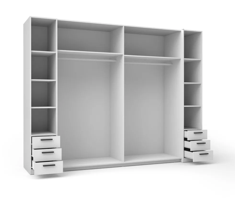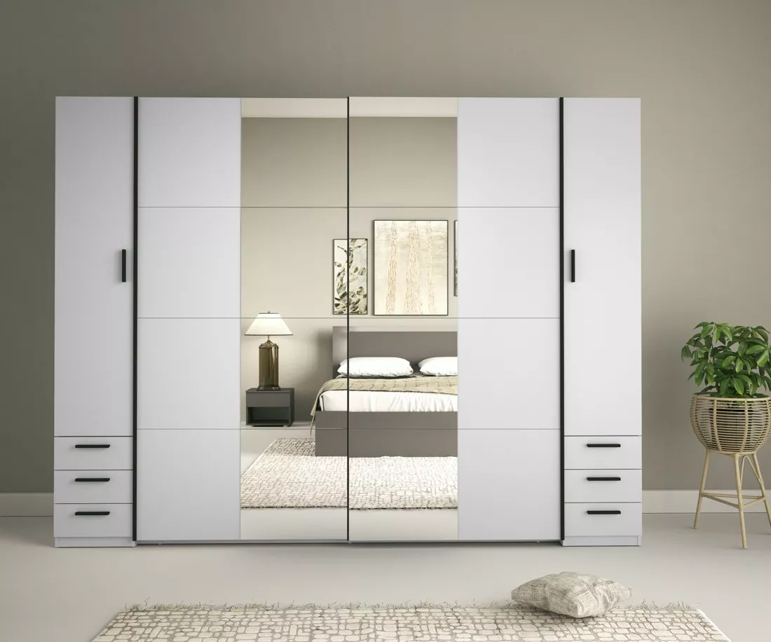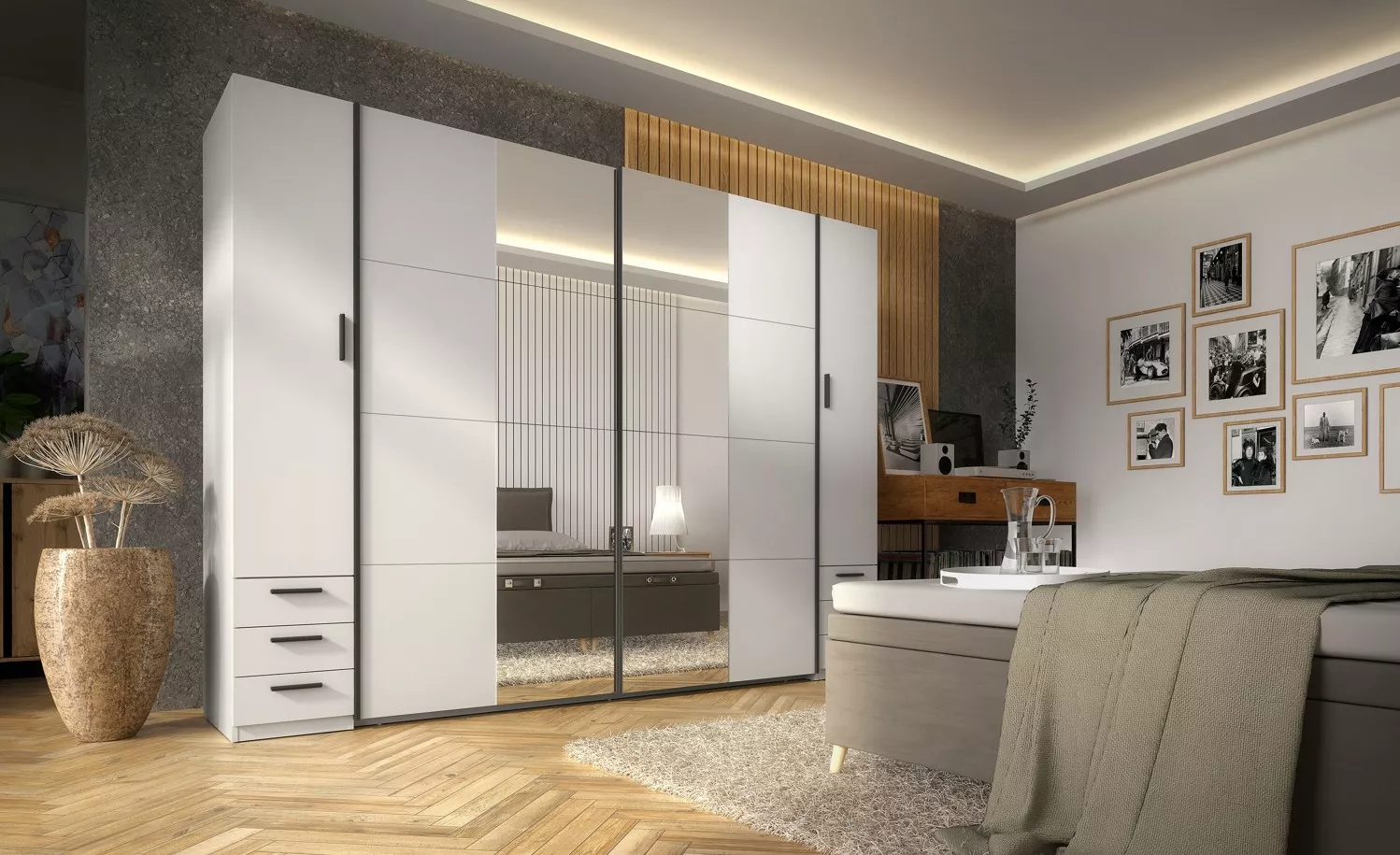 Zrcadlová šatní skříň GIRADOT v klasické bílé barvě je vynikající volbou pro ty, kteří hledají funkčnost a elegantní design. Skříň kombinuje klasické otevírací a posuvné dveře, což umožňuje pohodlné přizpůsobení různým prostorům. Interiér skříně byl navržen s ohledem na maximální funkčnost a nabízí četné police, šuplíky a šatní tyče, což poskytuje dostatek úložného prostoru.