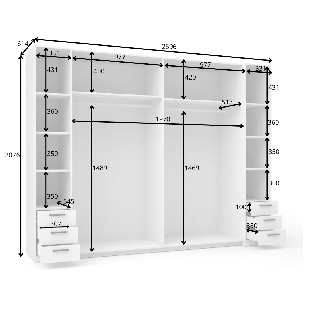 Zrcadlová šatní skříň 270 cm se šuplíky GIRADOT - bílá / černé úchyty
