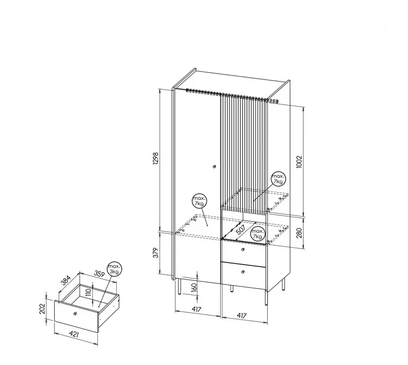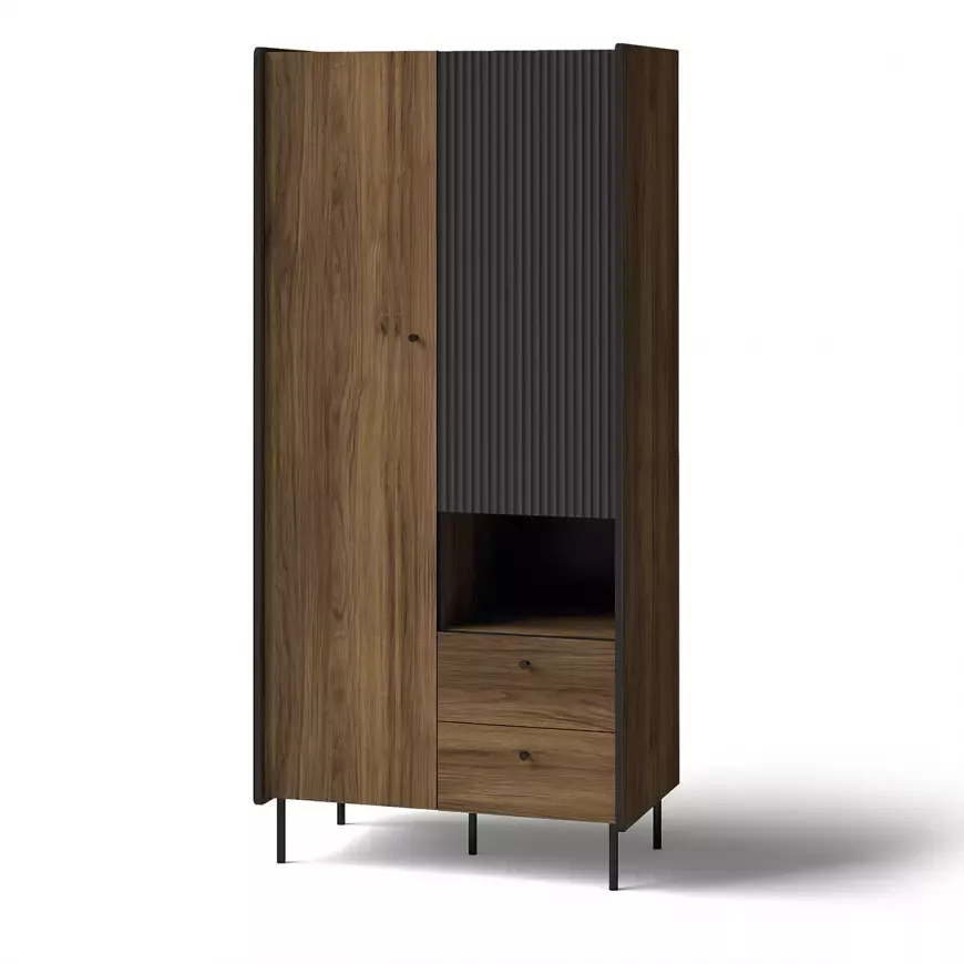 Vysoká šatní skříň 89 cm ASHEBORO se stane hlavním bodem vaší ložnice nebo obývacího pokoje. Kombinace šatní tyče, police, šuplíků a otevřené přihrádky nabízí praktické řešení pro uložení oblečení a doplňků. Stylová drážkovaná dvířka přidávají na osobitosti a designovém dojmu. Dekor dřeva v kombinaci s matnou černou barvou vytváří luxusní a elegantní vzhled.