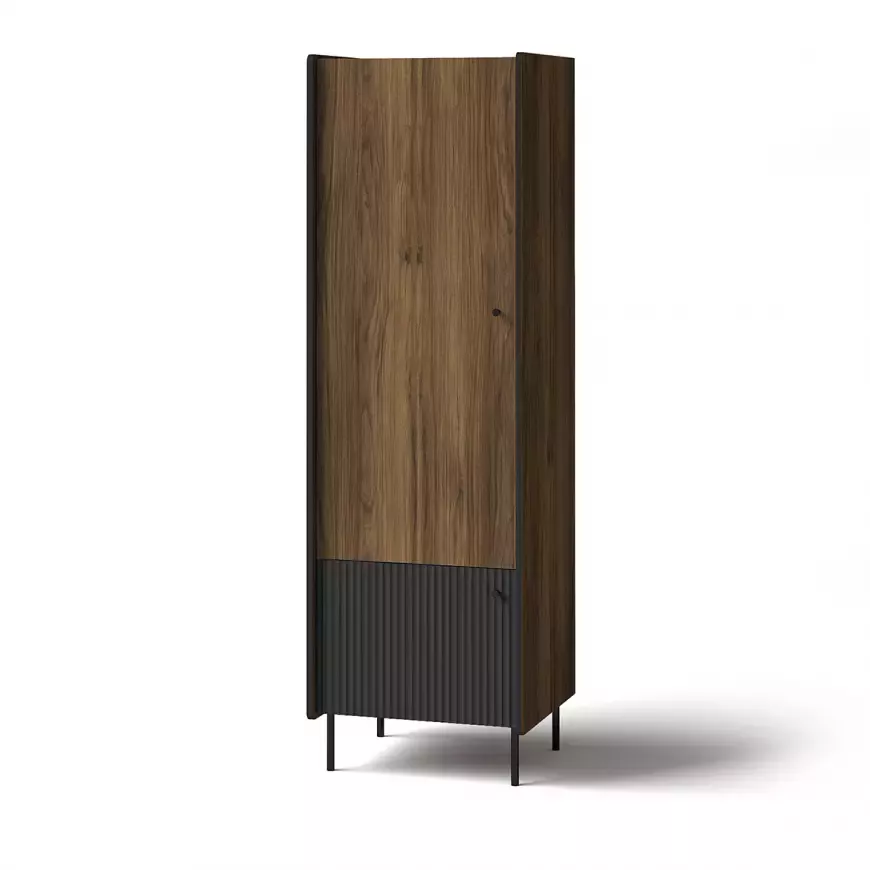 Policová šatní skříň 59 cm ASHEBORO se stane hlavním bodem vaší ložnice nebo obývacího pokoje. Kombinace šatní tyče a polic nabízí praktické řešení pro uložení oblečení a doplňků. Stylová drážkovaná dvířka přidávají na osobitosti a designovém dojmu. Dekor dřeva v kombinaci s matnou černou barvou vytváří luxusní a elegantní vzhled.