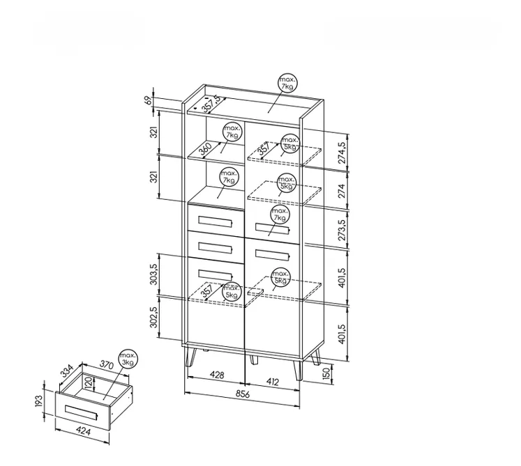 Policová skříň 90 cm DOBSON je postavená na pevných nohou, které skříni zajišťují stabilitu. Disponuje 5 policemi a 2 šuplíky. Skříň skvěle zapadne do každého studentského nebo dětského pokoje.