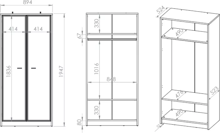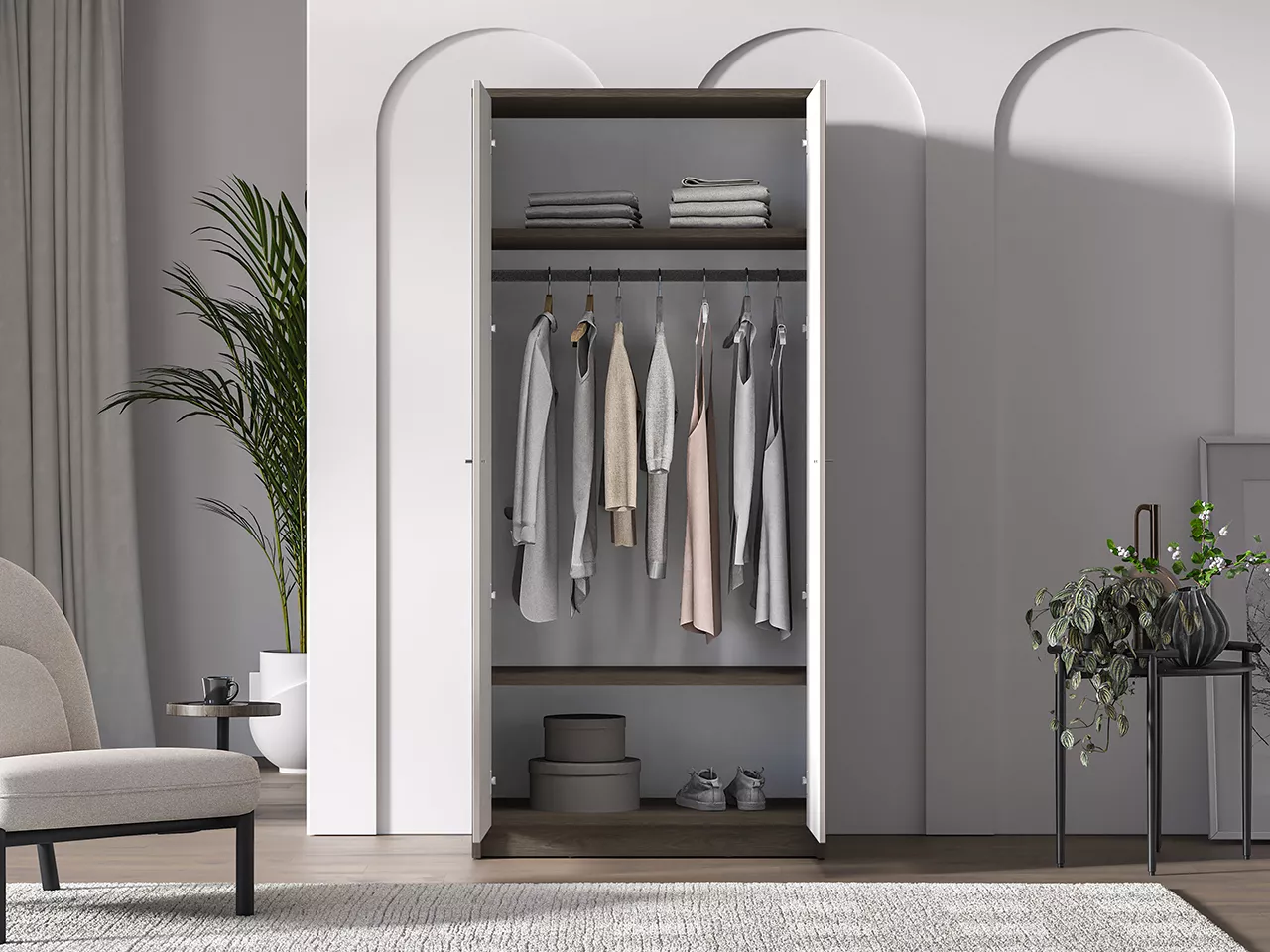 Šatní skříň 89 cm SAFIEH je stylovým i praktickým kouskem nábytku do každé ložnice nebo předsíně. Disponuje 2 prostornými policemi a šatní tyčí. Systém tichého dovírání zpříjemní každodenní používání.