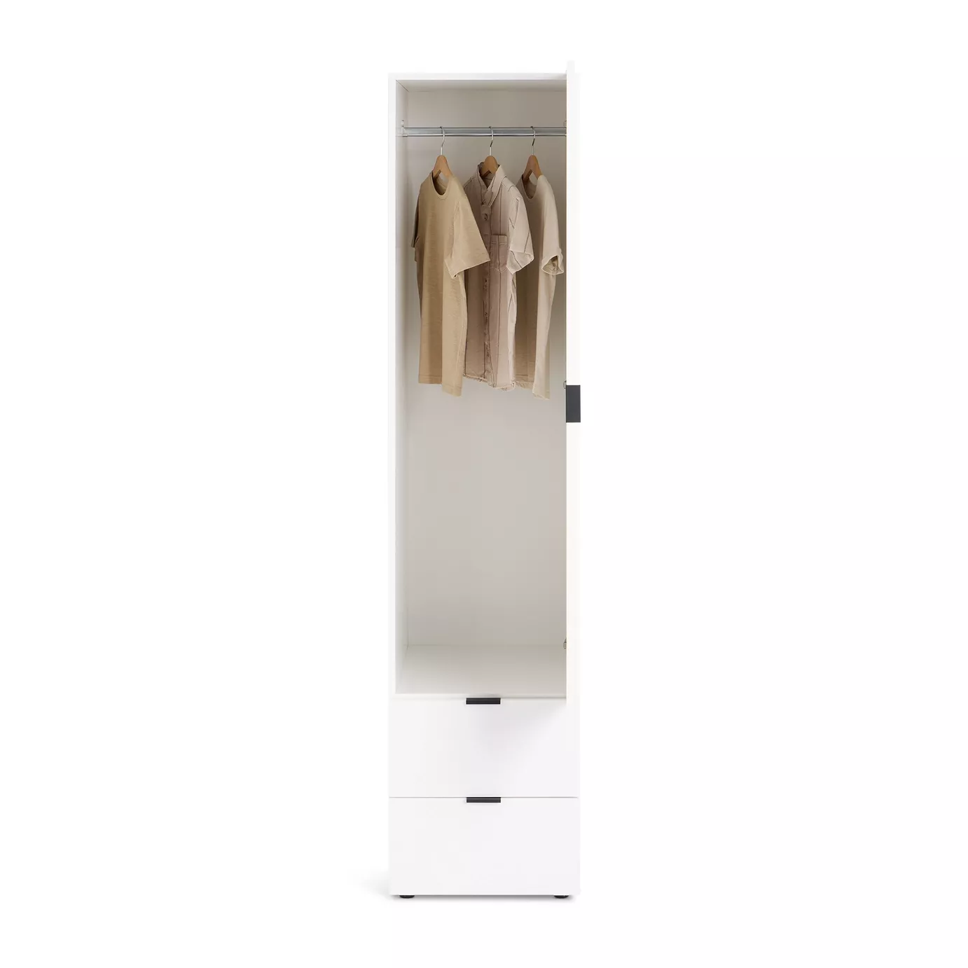 Úzká šatní skříň 45 cm ZARA skvěle zapadne do každé moderní ložnice. Nabízí spoustu prostoru pro uložení oblečení. Disponuje 2 šuplíky a šatní tyčí.