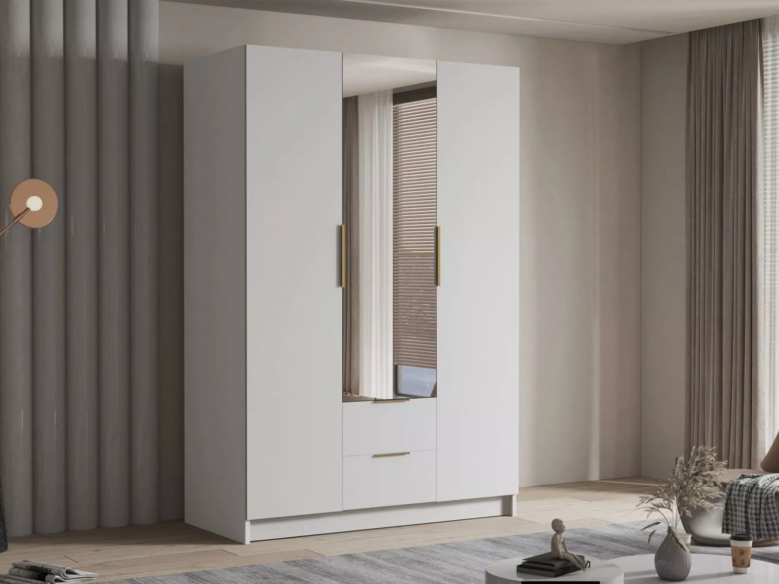 Vysoká šatní skříň 150 cm se zrcadlem MARILA - bílá / zlatá