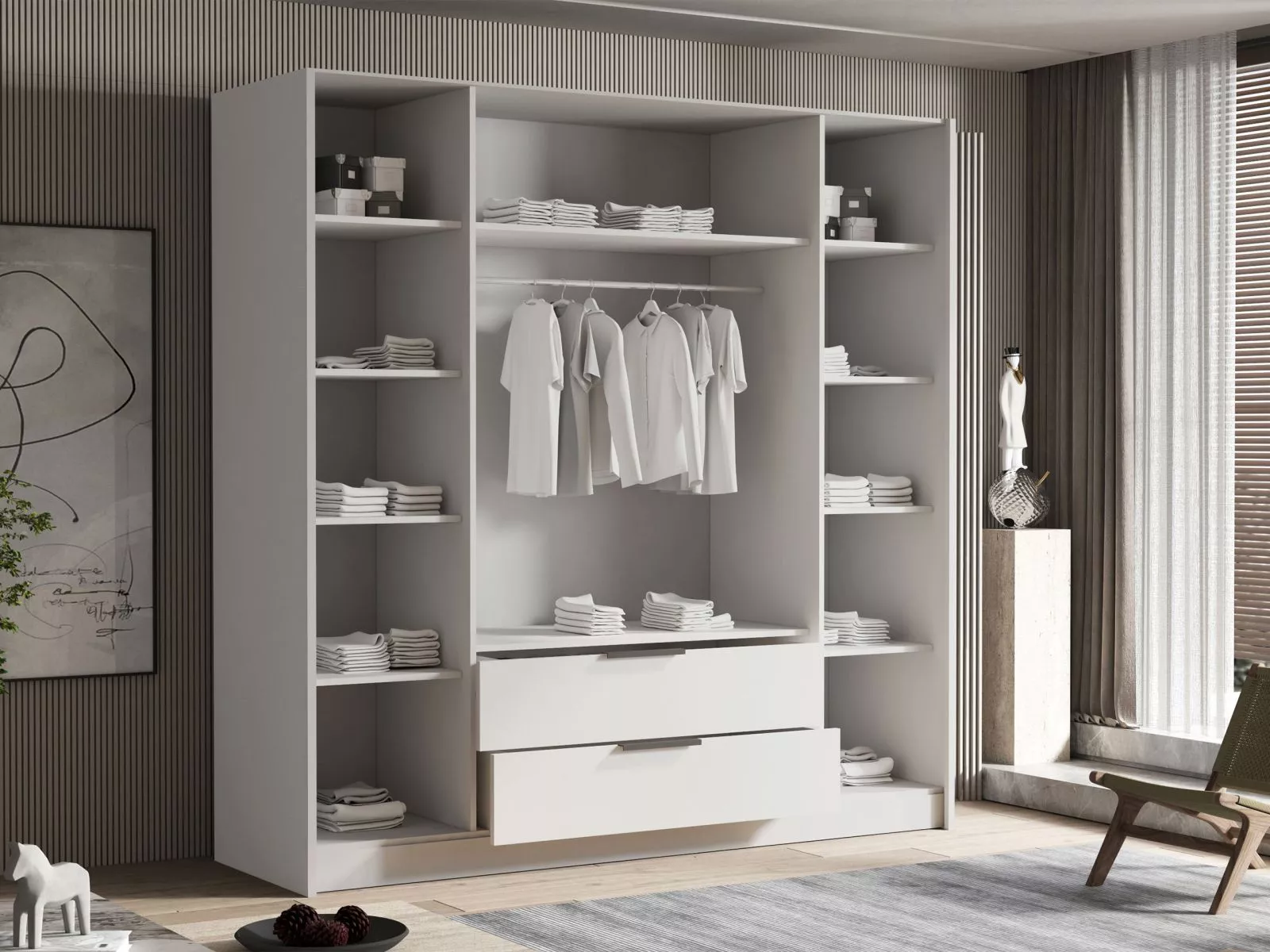 Dopřejte si velkou šatní skříň BETILA a užijte si dostatek místa pro každý kousek oblečení. Prostorné police a zásuvky udrží pořádek mezi svetry a doplňky, šatní tyč zajistí dokonalý prostor pro kabáty, košile a šaty. Velké zrcadlo na předních dveřích opticky zvětší místnost a zpříjemní každodenní přípravy.