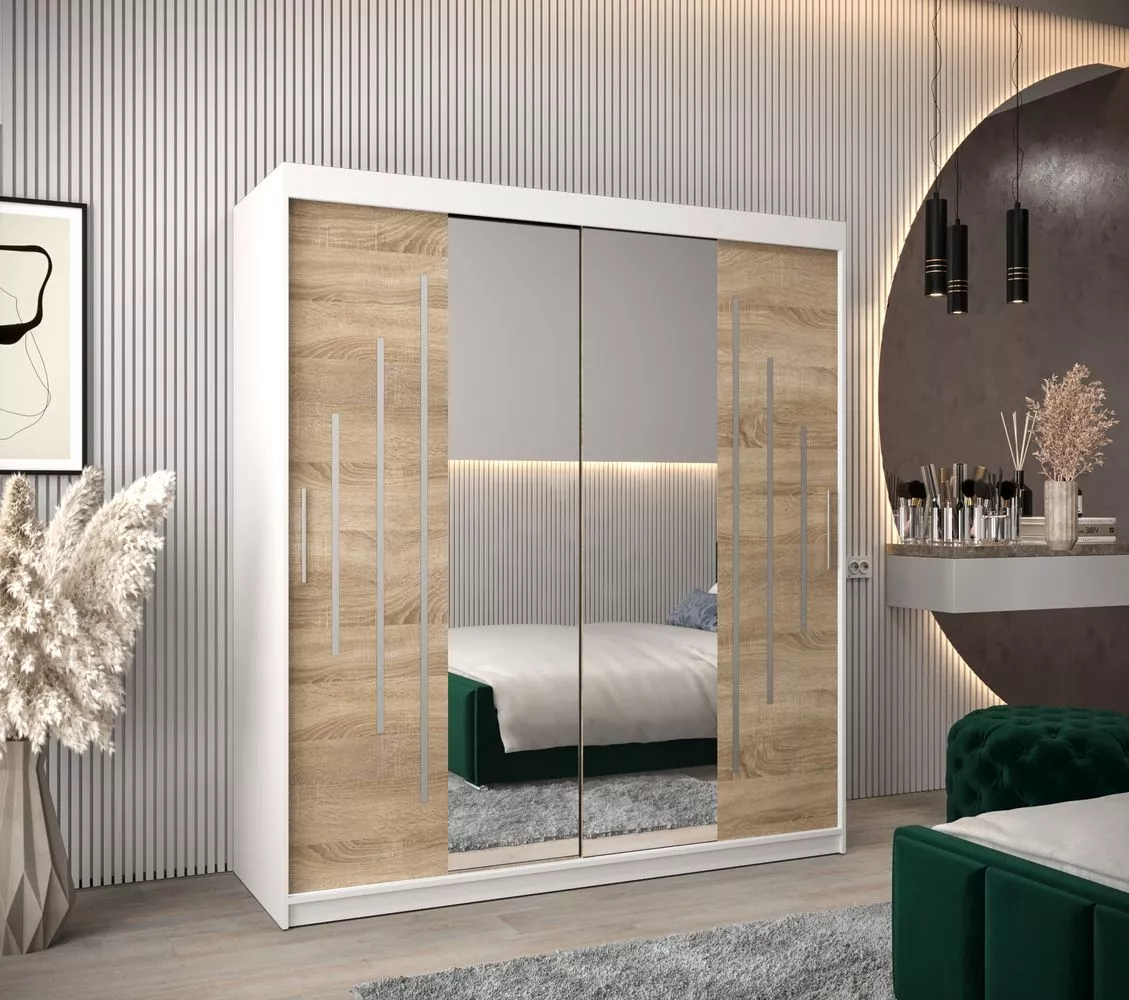 VÝPRODEJ - Šatní skříň se zrcadlem EWELINA - šířka 180 cm, bílá / dub sonoma