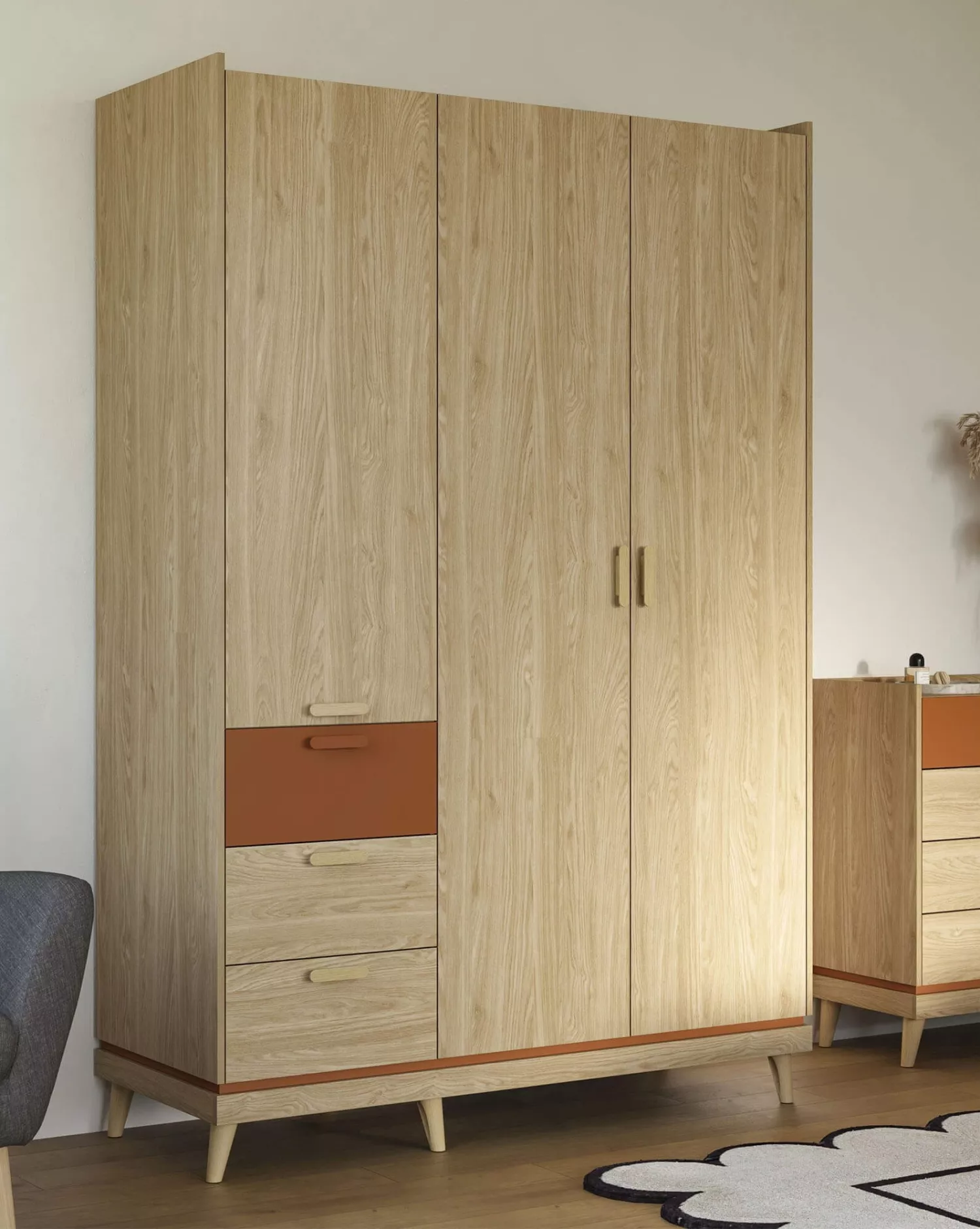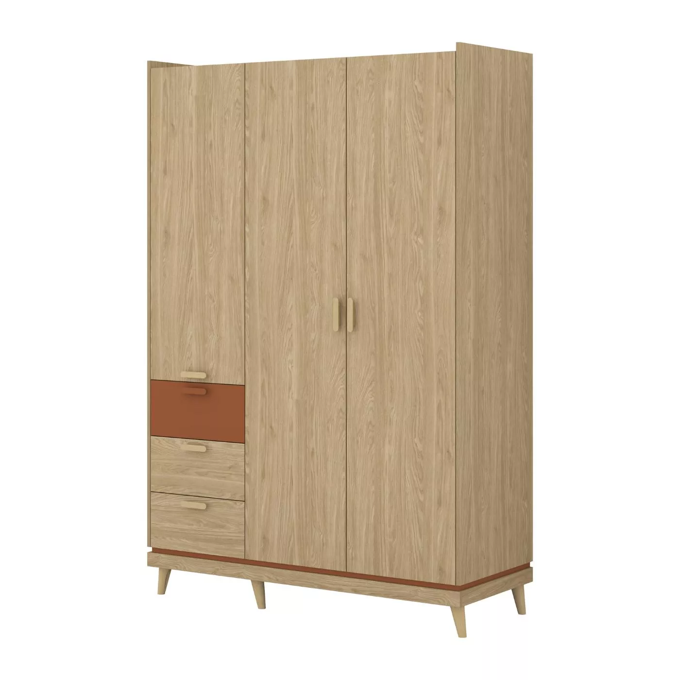 Třídveřová skříň se šuplíky 144 cm ARWEN - dub / cihlová