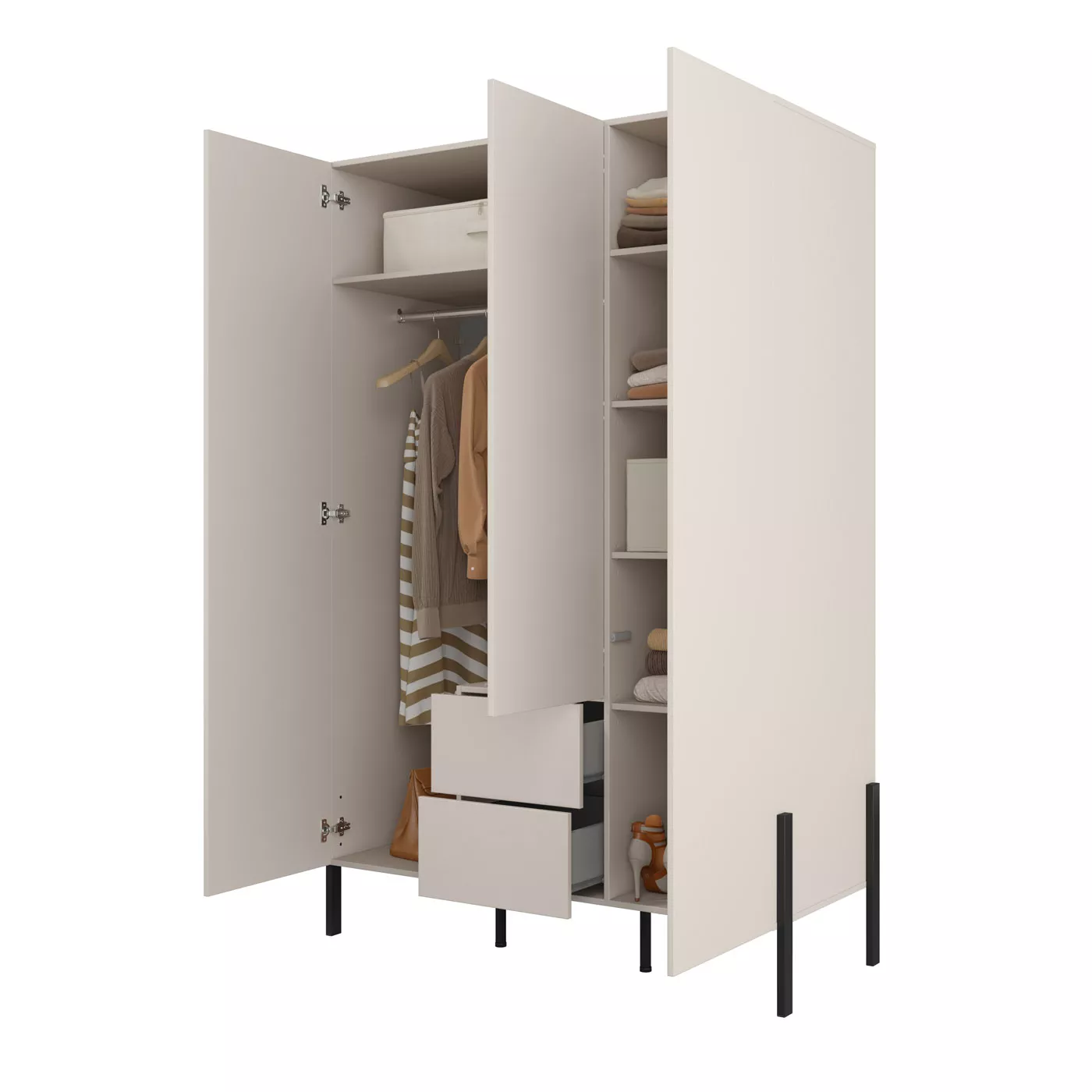 Vysoká šatní skříň 139 cm ADIS S na první pohled zaujme svými vysokými kovovými nožkami. Disponuje velkým množstvím úložného prostoru pro uložení a zavěšení veškerého oblečení. Skříň je vybavená systémem otevírání push to open, což zpříjemní její každodenní používání.