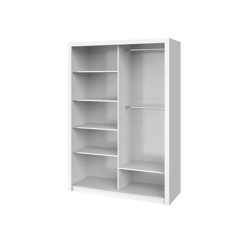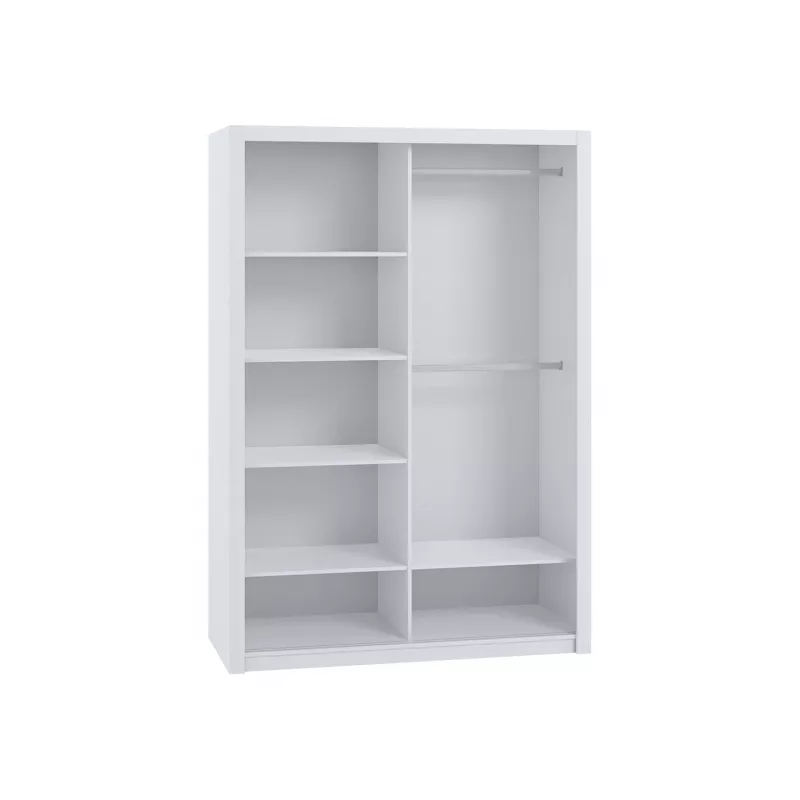 Šatní skříň s posuvnými dveřmi CORTLAND 2 se hodí do každého moderního interiéru. Vnitřní uspořádání je tvořeno hlubokými policemi a samostatnou věšákovou zónou vybavenou šatními tyčemi na ramínka.