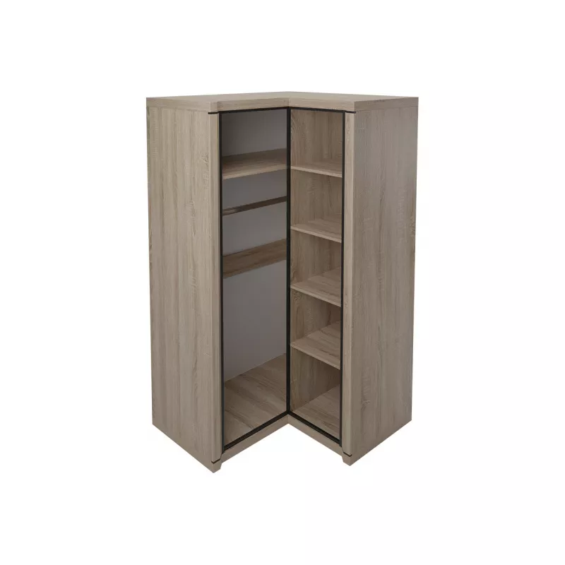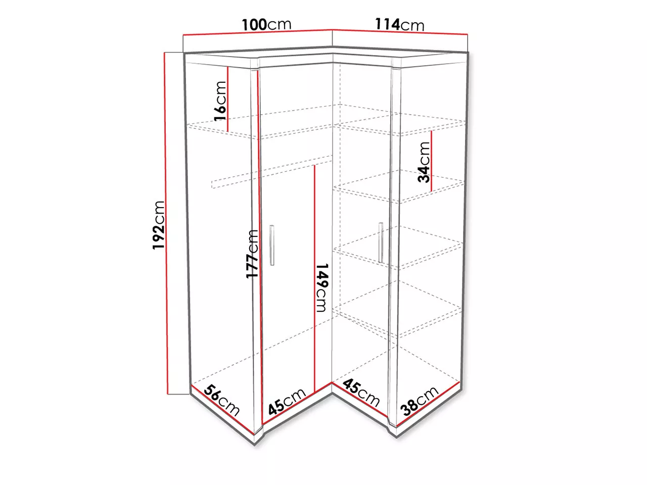 Rohová šatní skříň ARIKA může být doplňkem každé ložnice. Skříň je vybavena řadou prostorných vnitřních polic a věšákovou tyčí, které umožňují snadné oddělení oblečení a udržují jej v dokonalém pořadí. Kvalitní komponenty, zejména LTD deska, zajišťují stabilitu a životnost skříňky. Součástí balení jsou tři přídavné police.