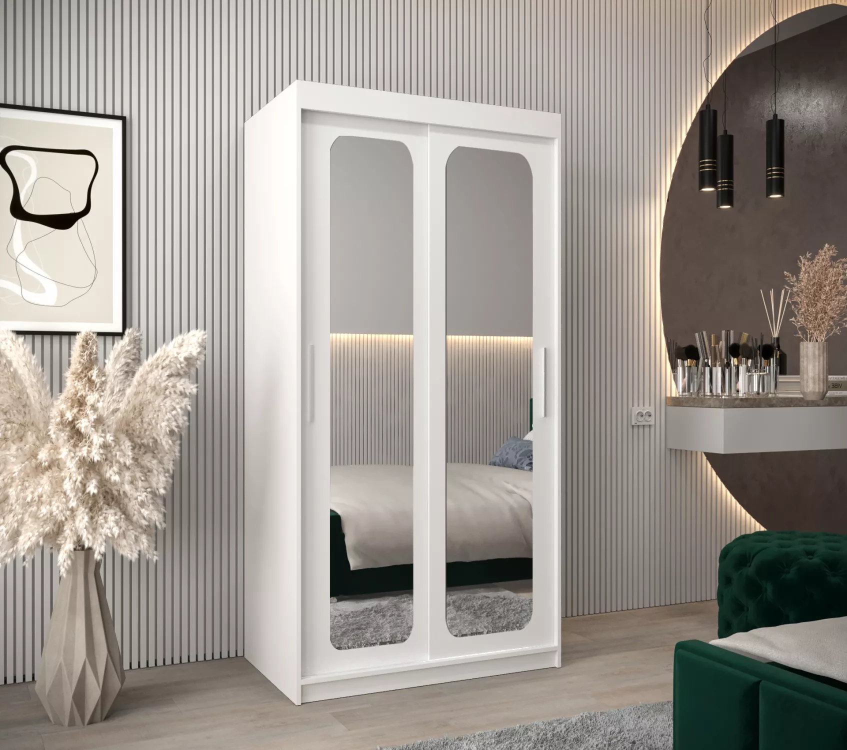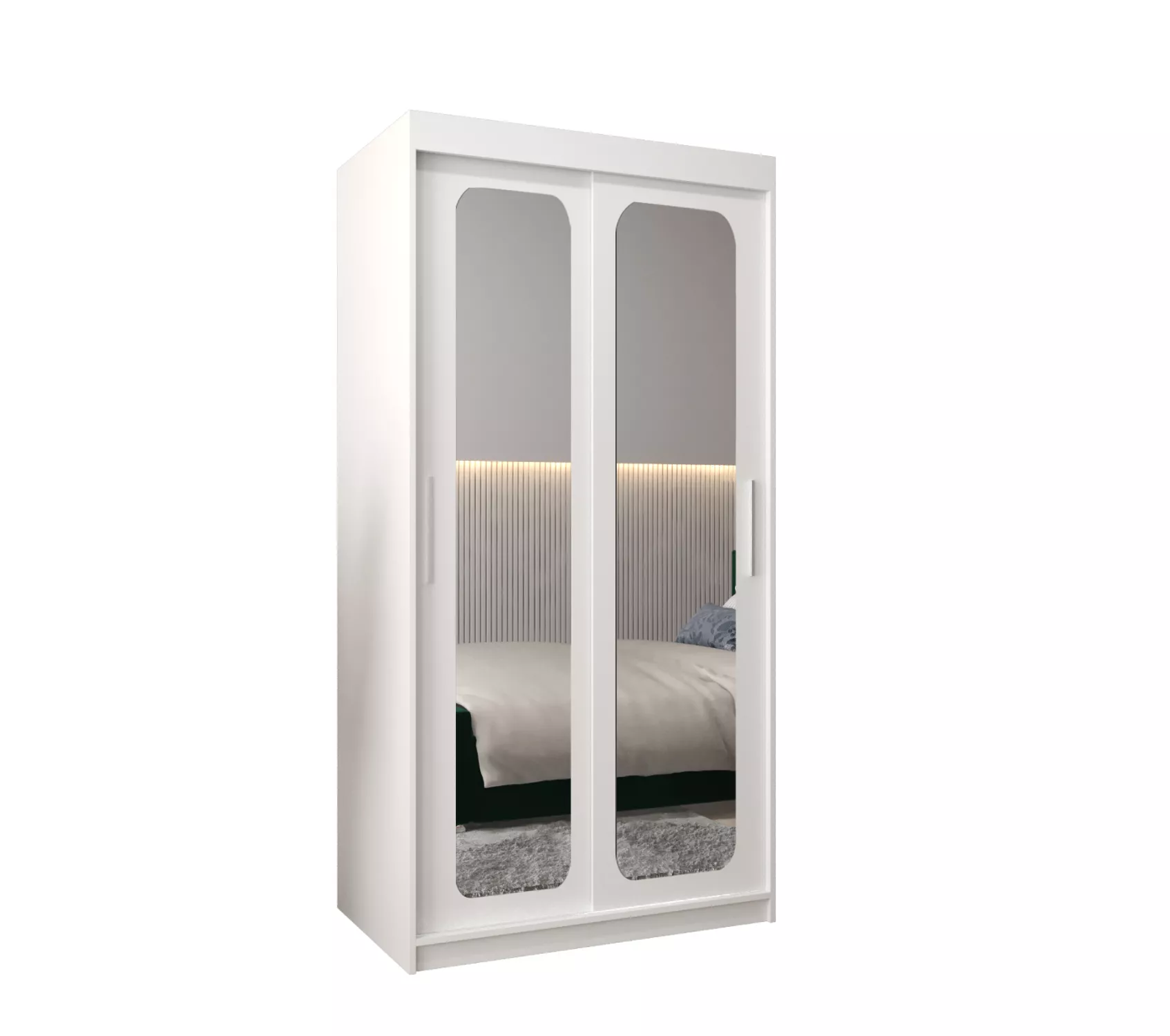 Zrcadlová skříň DONICELA zaujme především moderním designem a oválnými zrcadly. Vnitřek skříně je vybaven policovým systémem a 2 šatními tyčemi.
