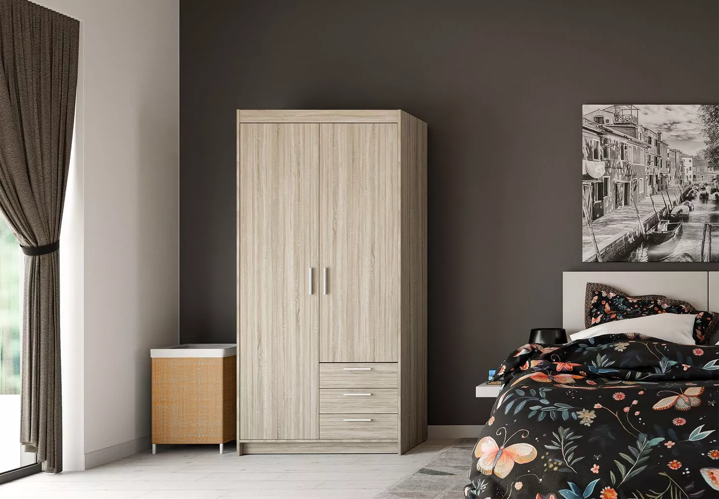 Dvoudveřová skříň 90 PILINA se šuplíky je vhodná do všech moderních ložnic či předsíní. Součástí skříně jsou 4 police, 1 šatní tyč a 3 šuplíky.