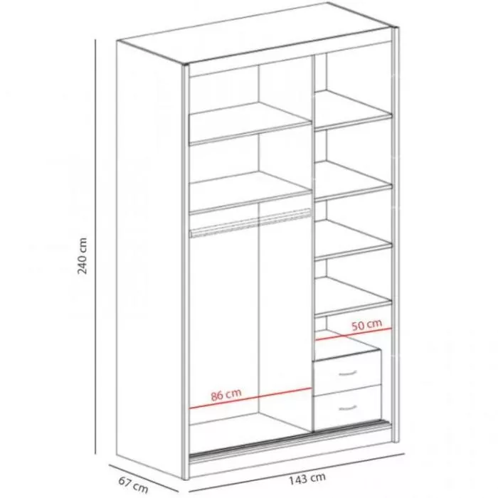 Šatní skříň s posuvnými dveřmi ANICA se hodí do každého moderního interiéru. Vnitřek skříně ukrývá šatní tyč, police a šuplíky.