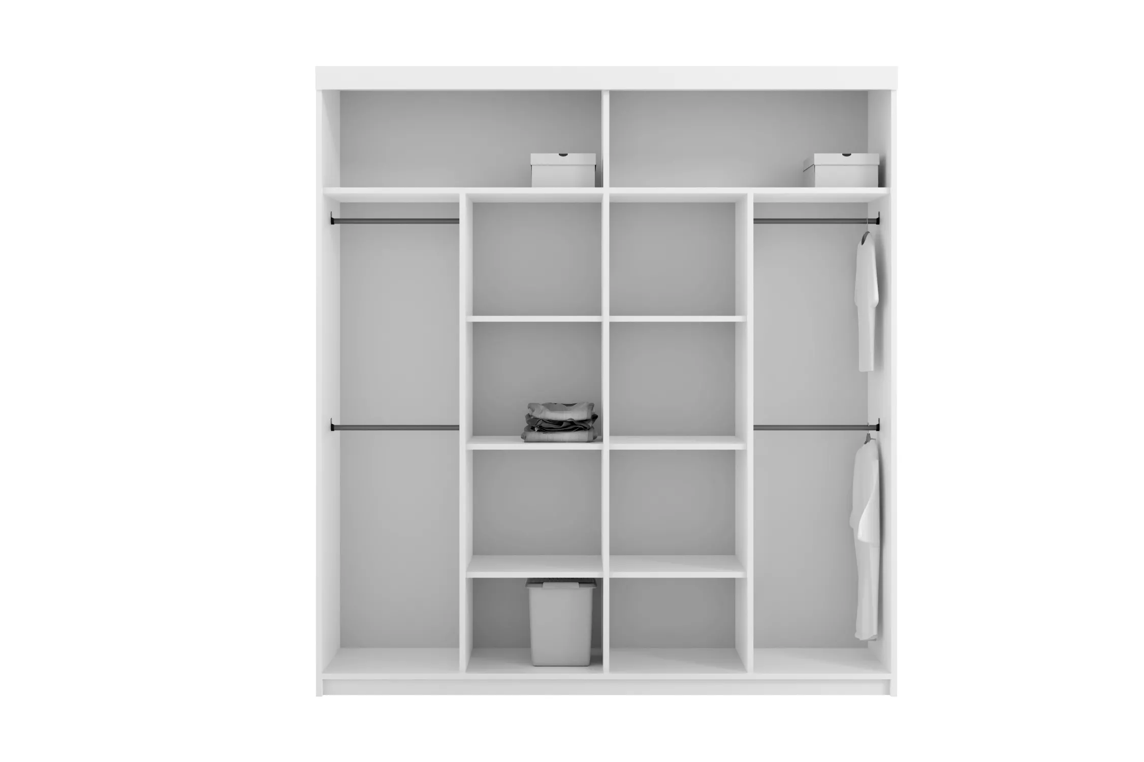 Šatní skříň se zrcadlem KAILAN představuje spojení elegance a funkcionality. Vnitřní uspořádaní skříně lze libovolně měnit a vytváří tak dostatek úložného prostoru v podobě šatních tyčí a polic.